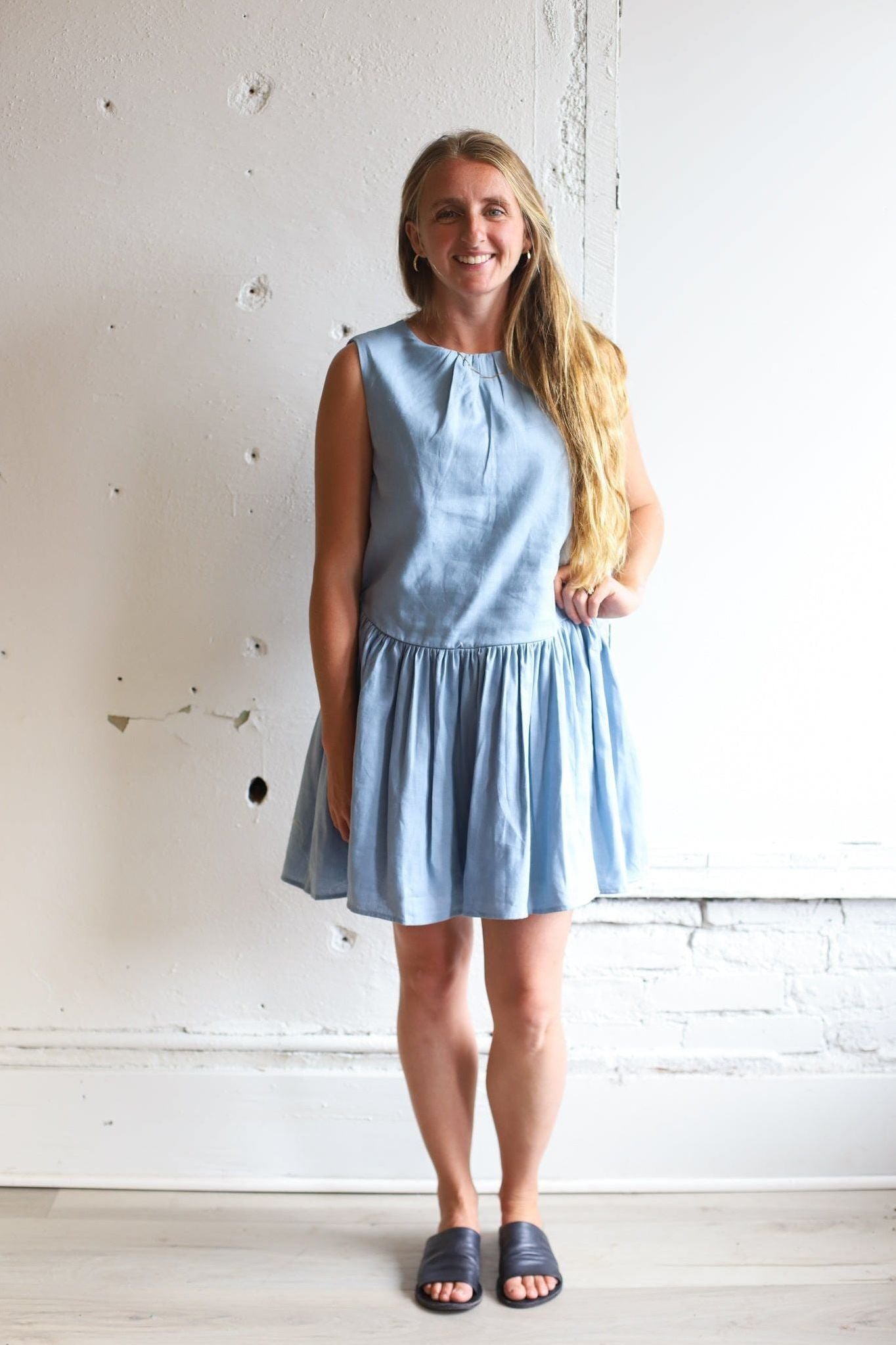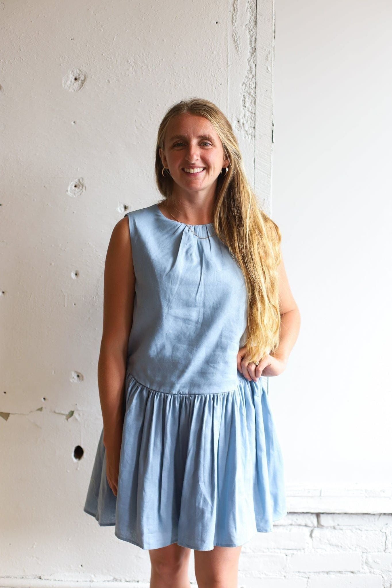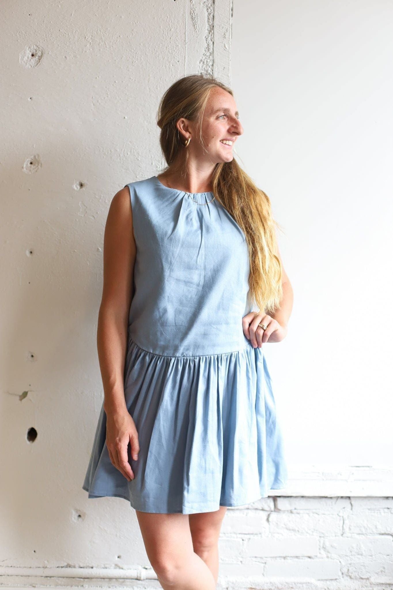 Sleeveless mini dress with relaxed round neckline! A drop waist design with softly gathered skirt, Subtle A-line silhouette offers a breezy shape, Lightweight, unlined fabric perfect for warmer days. An easy, versatile piece for everyday or vacation wear