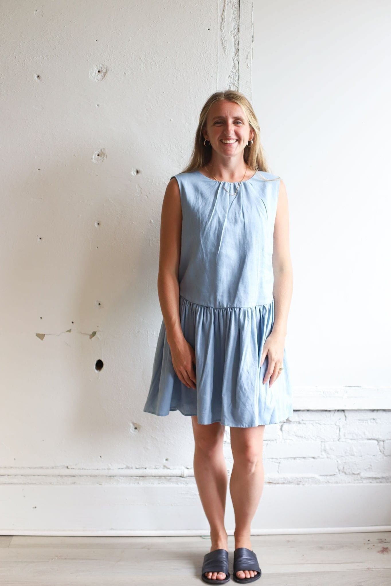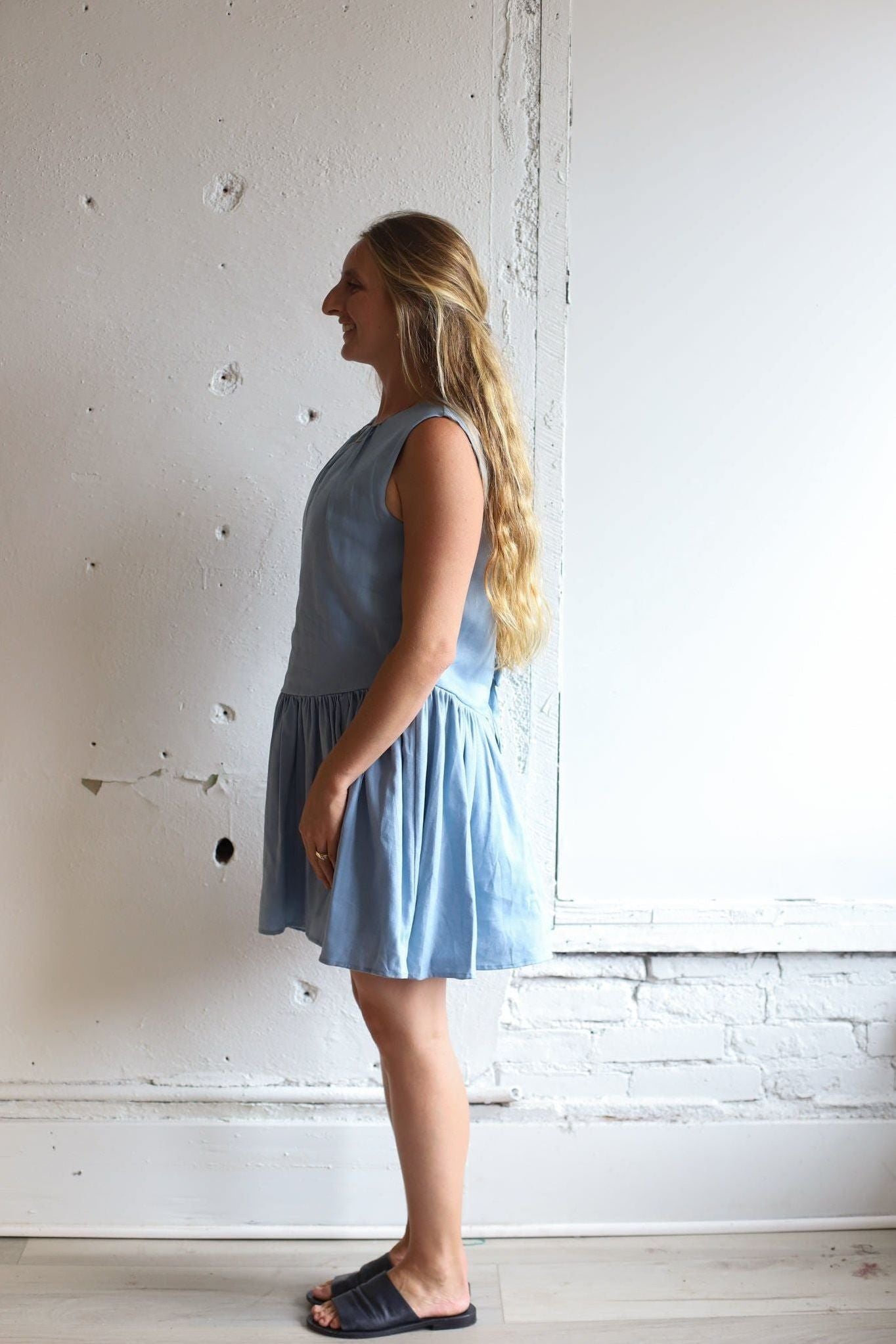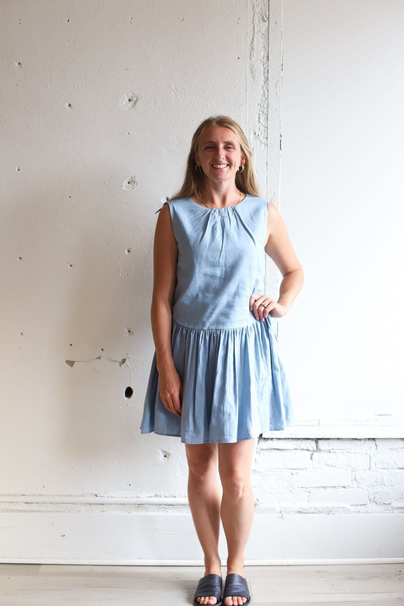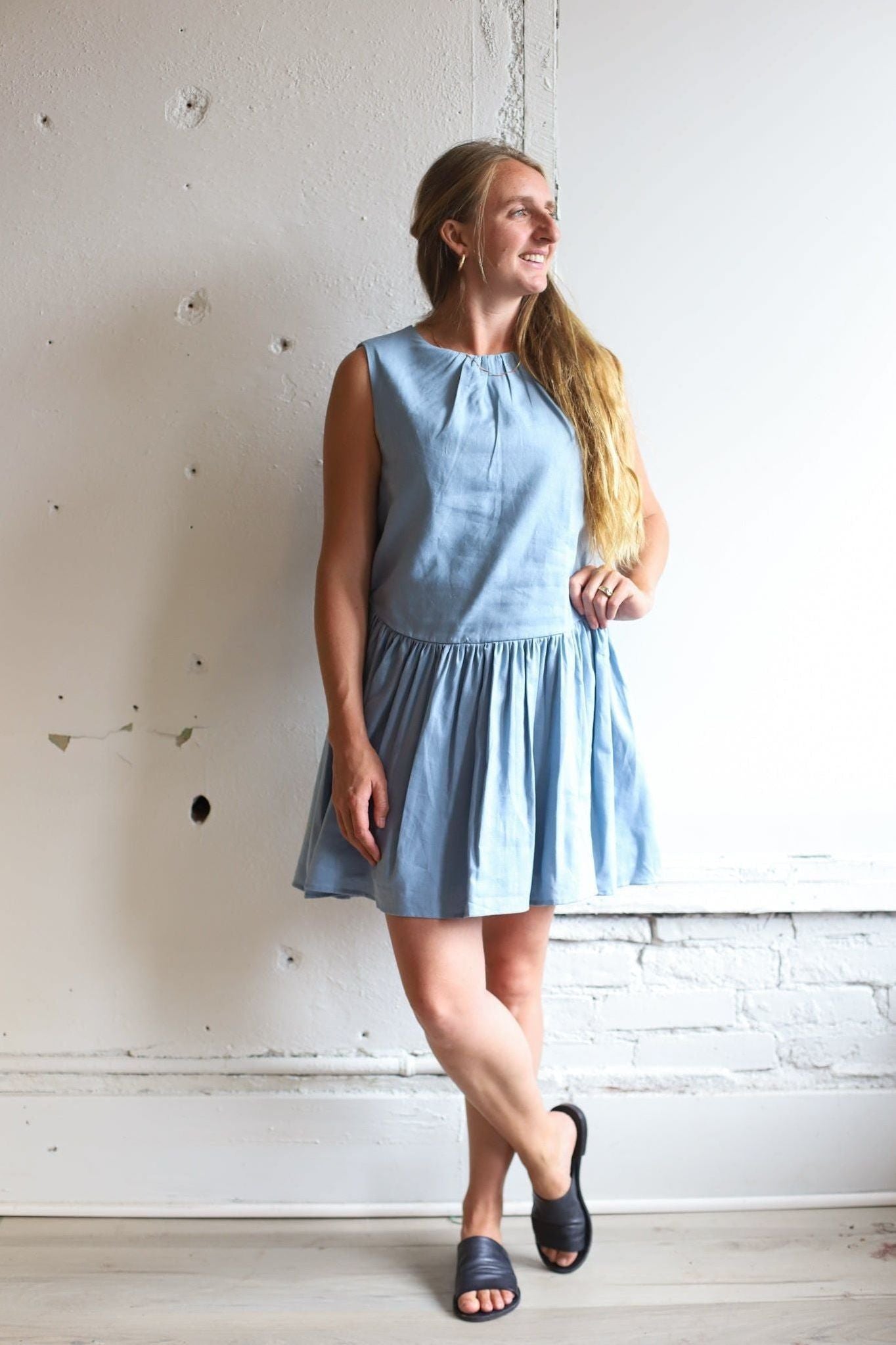 Sleeveless mini dress with relaxed round neckline! A drop waist design with softly gathered skirt, Subtle A-line silhouette offers a breezy shape, Lightweight, unlined fabric perfect for warmer days. An easy, versatile piece for everyday or vacation wear