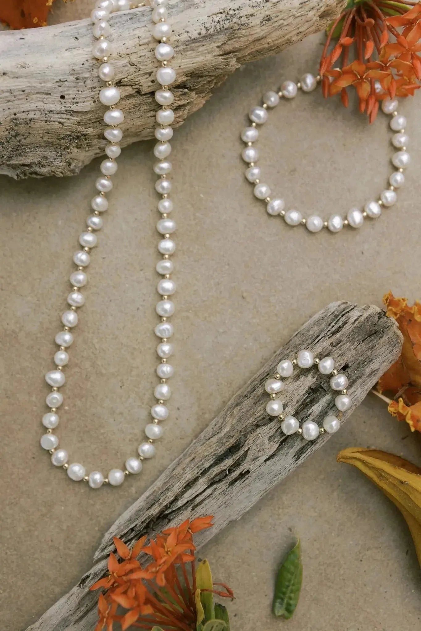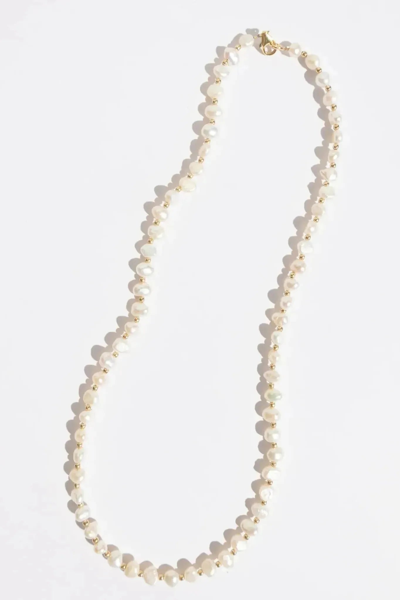 The Ada Pearl Necklace is an iconic pearl statement piece with gold filled beads separating the fresh water pearls. Easy to pair with your everyday outfit or dress it up for a night out! Designed and created in store in Steamboat Springs, CO.