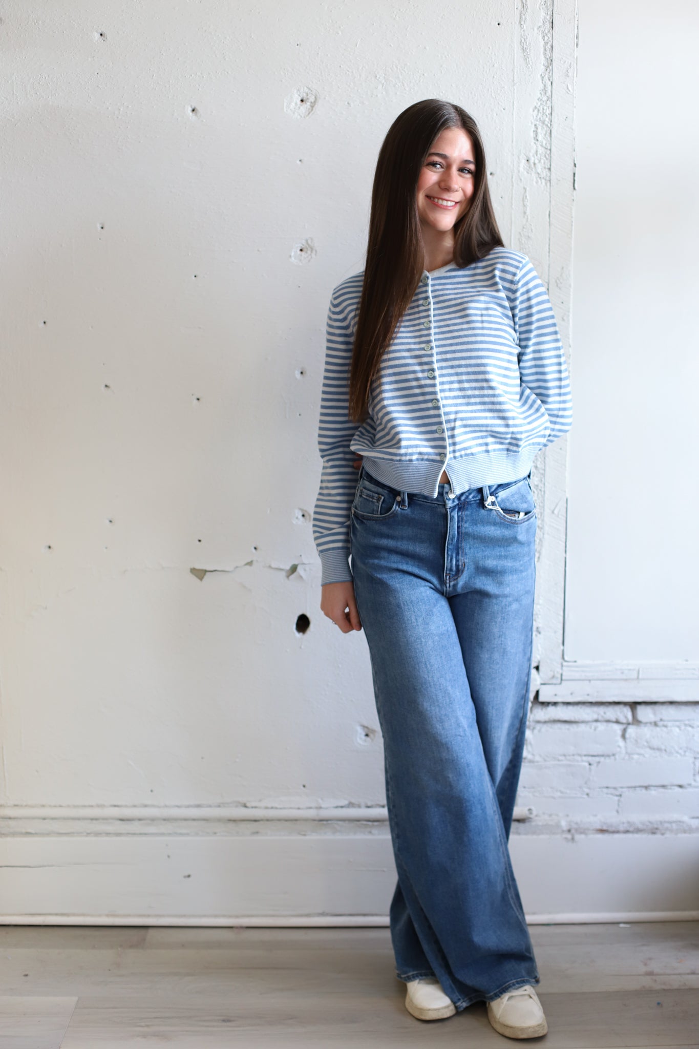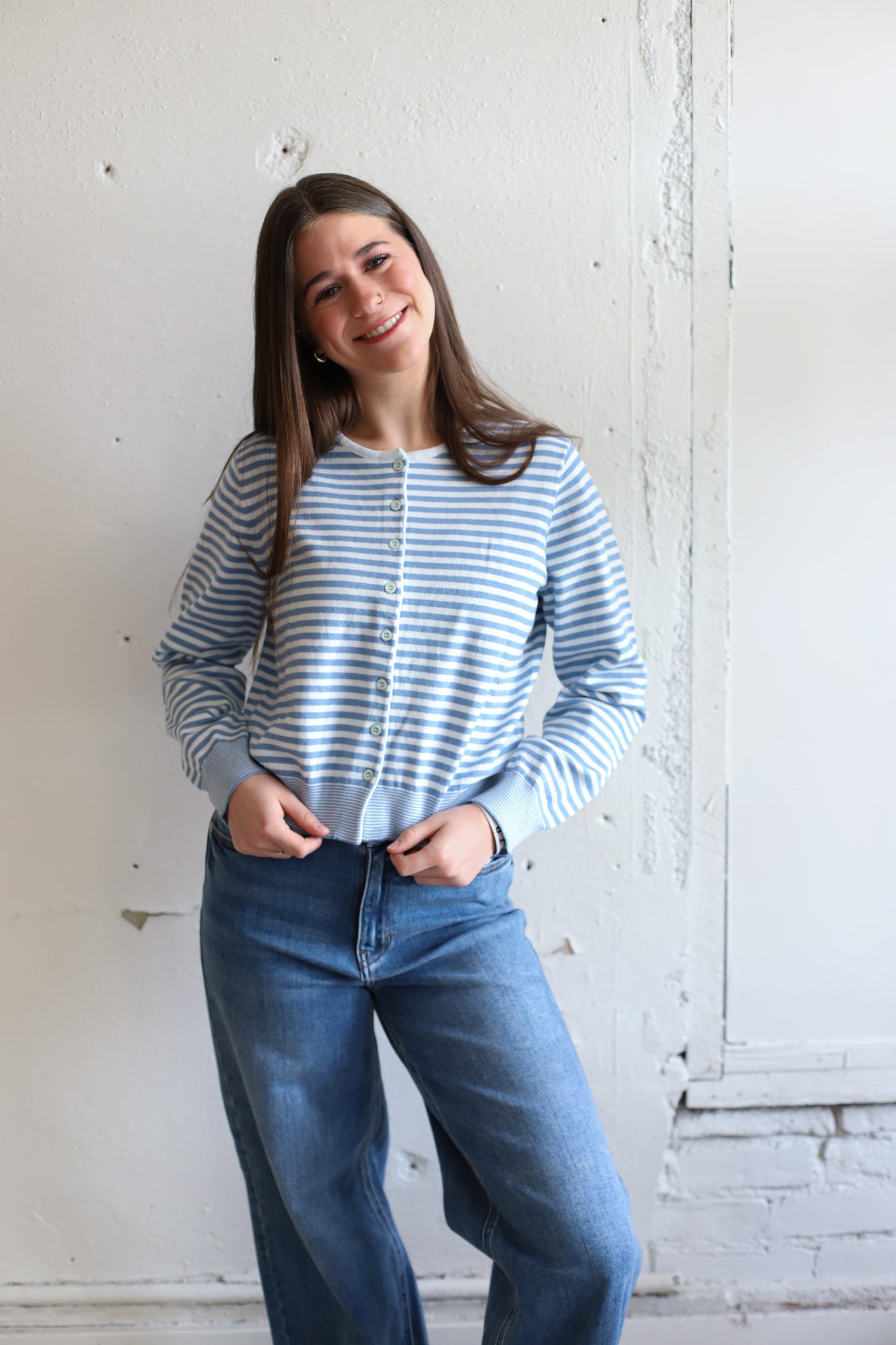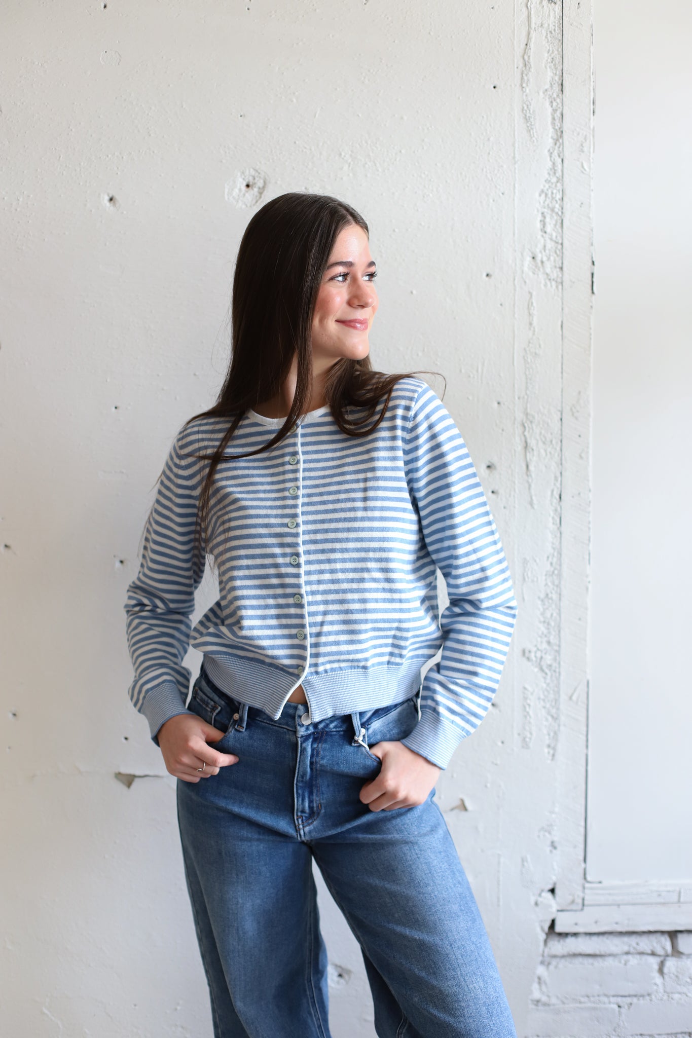 The Crystal Cardigan is a light-weight blue and white striped cardigan made of soft knit fabric! The cardigan features a crew neckline, front button closures, ribbed hem, cuffs, and neckline, and a cropped, relaxed fit!