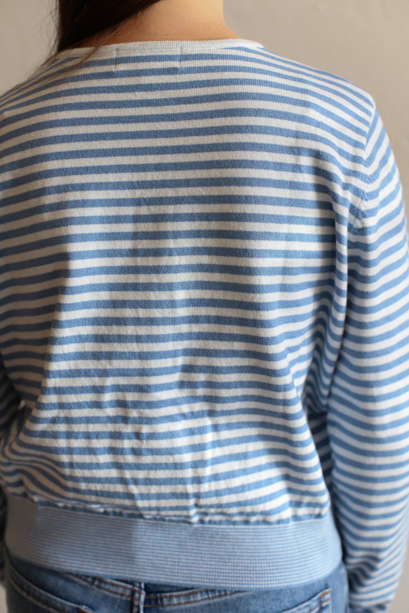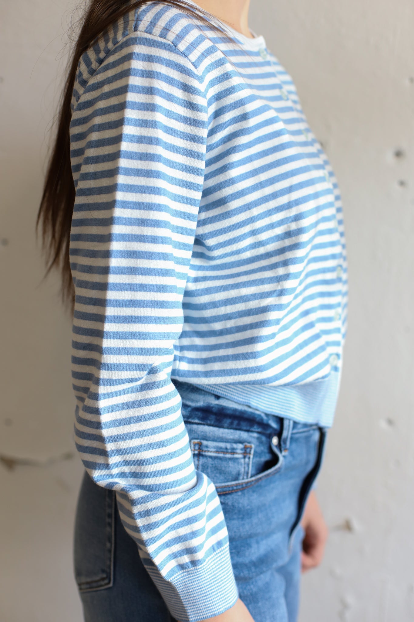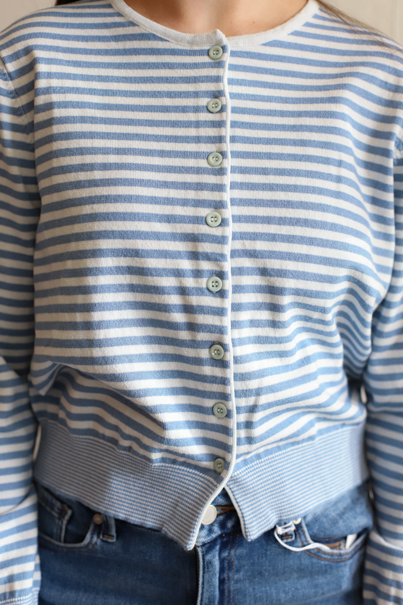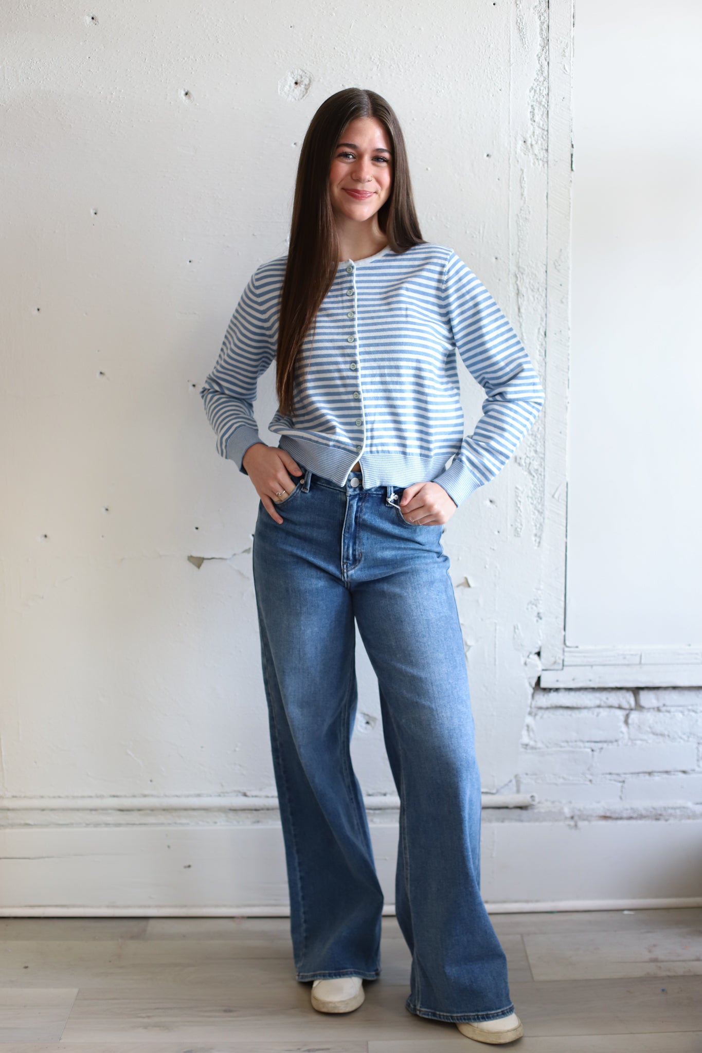 The Crystal Cardigan is a light-weight blue and white striped cardigan made of soft knit fabric! The cardigan features a crew neckline, front button closures, ribbed hem, cuffs, and neckline, and a cropped, relaxed fit!