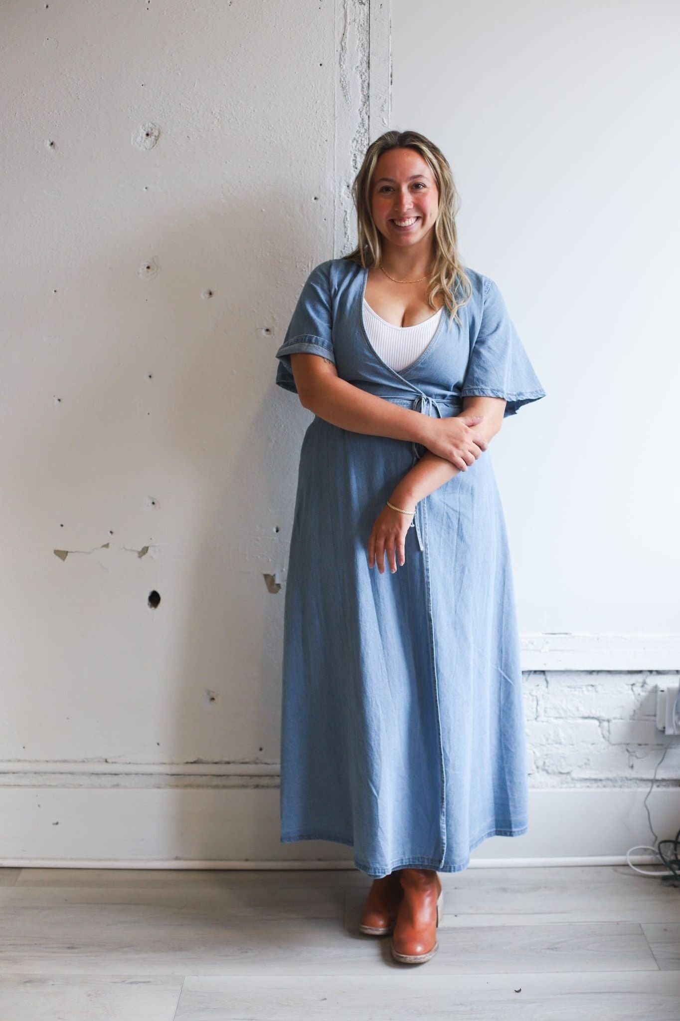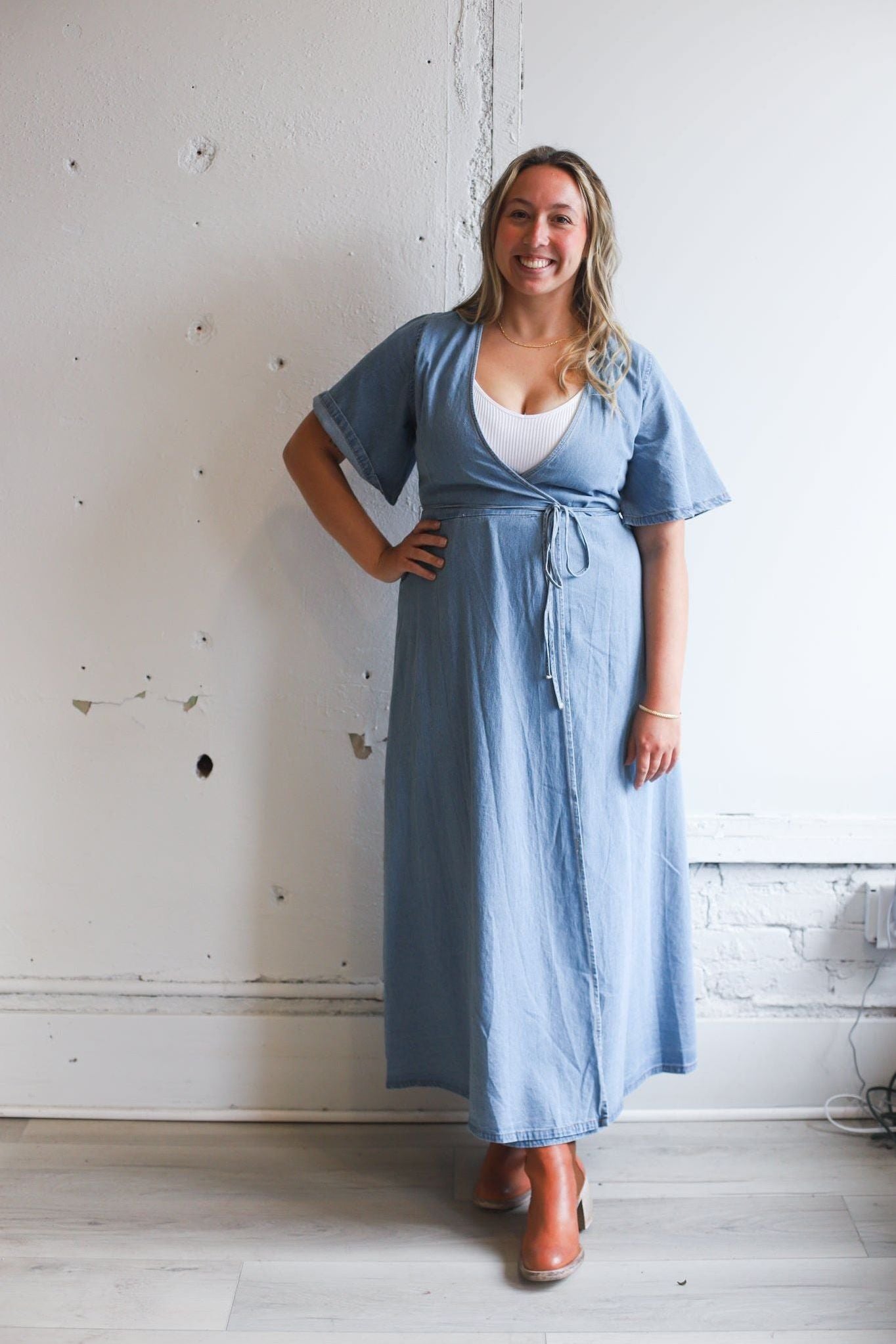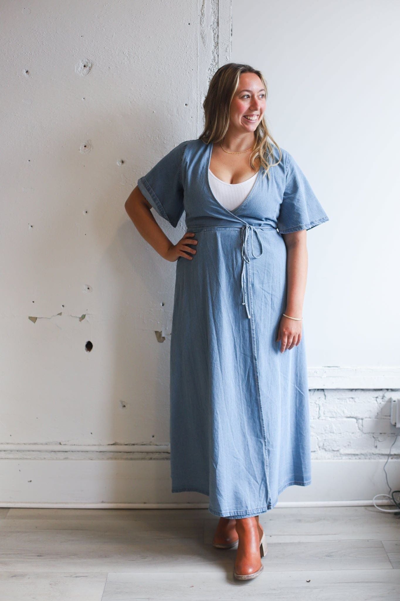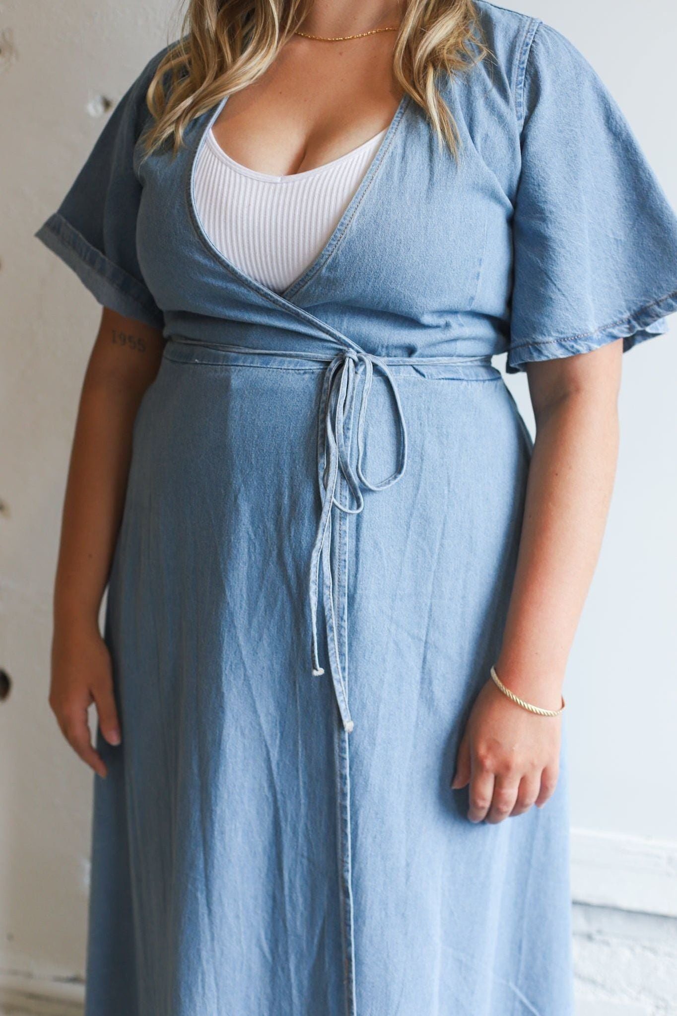 WASHED DENIM WRAP DRESS! A perfect piece for transitioning into cooler weather--pair with your favorite boots or cardigan!