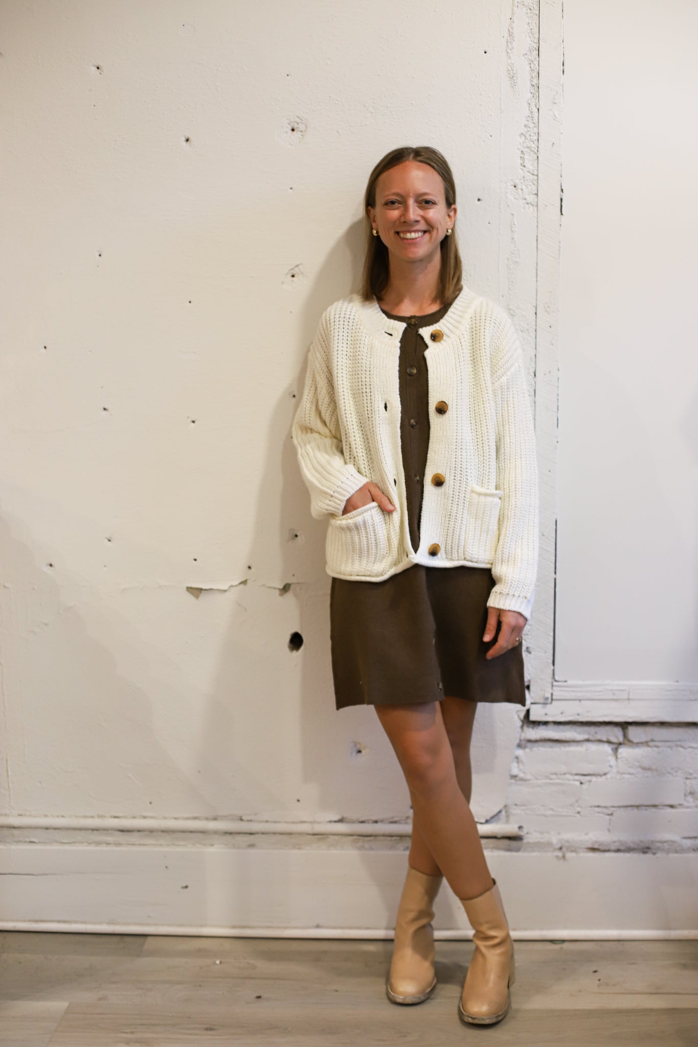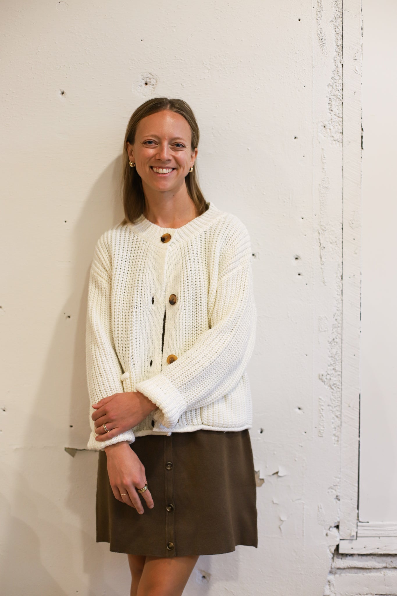 A creamy white knitted cardigan with oversized button detail!