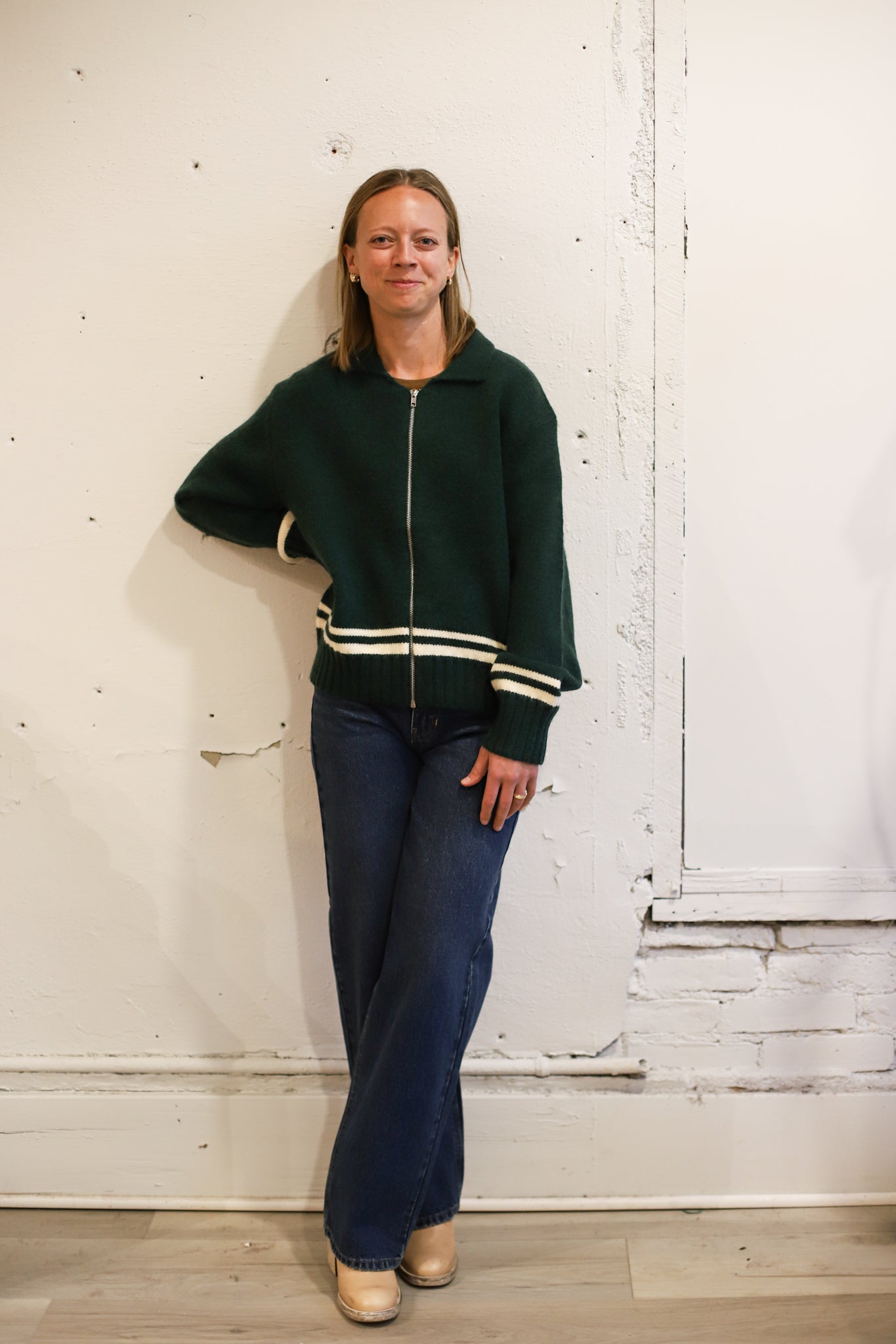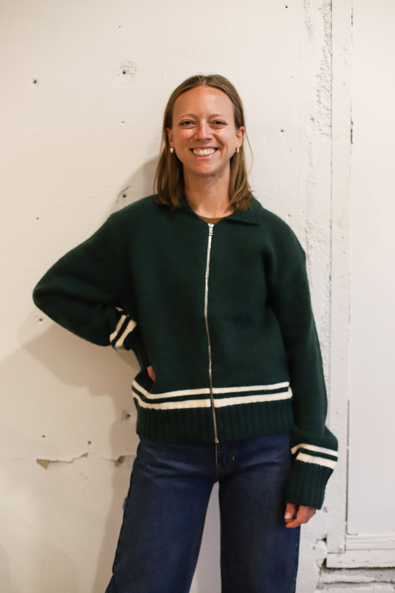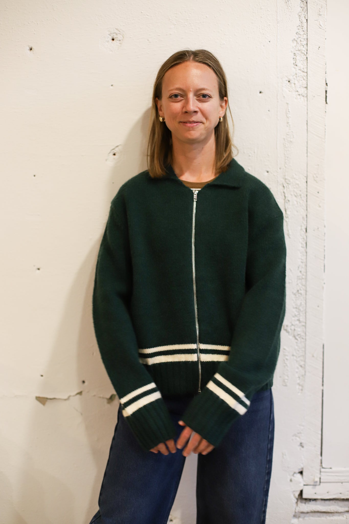 Add a retro-sporty vibe to your shop floor with this varsity-inspired knit zip-up jacket.