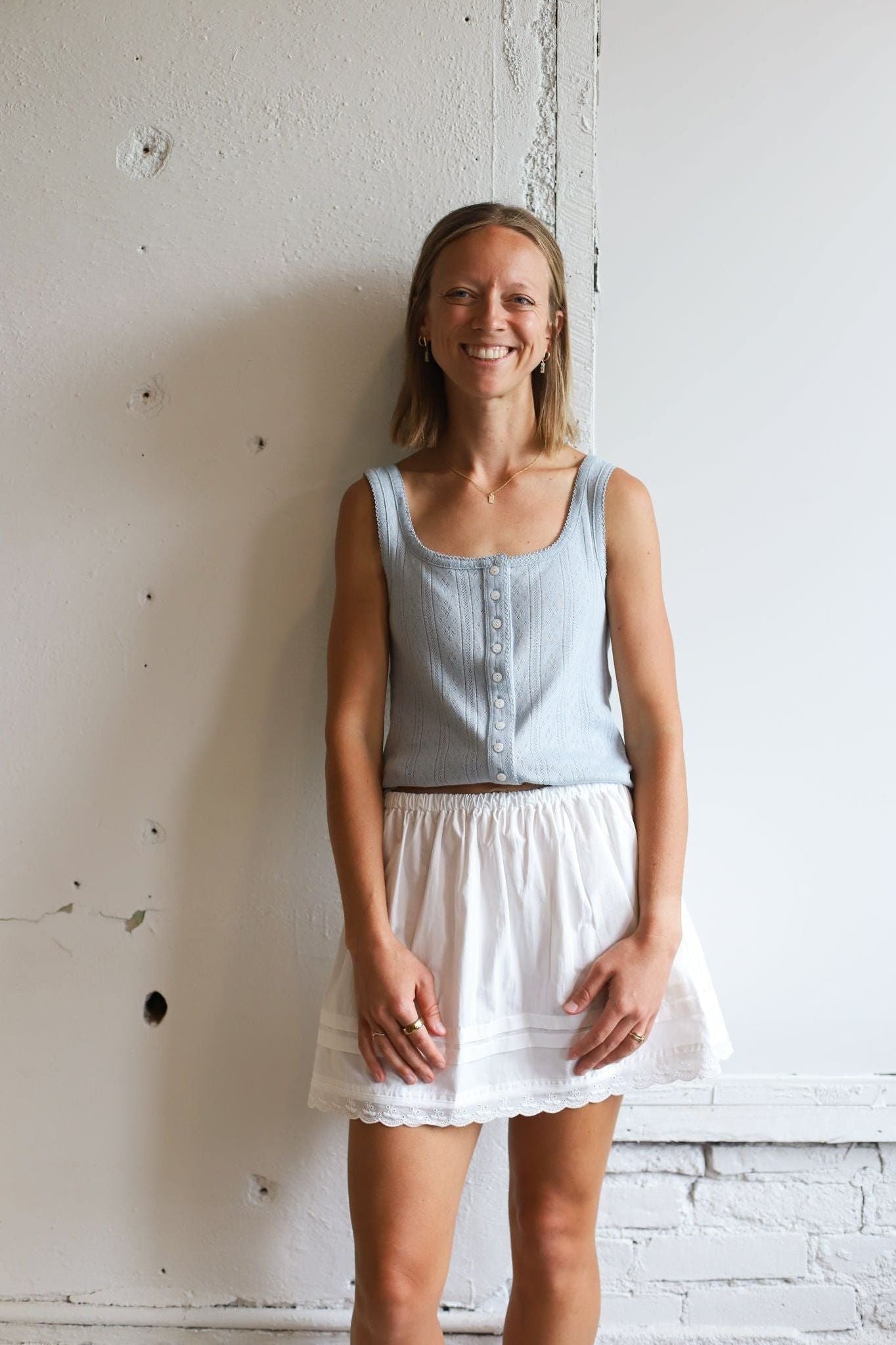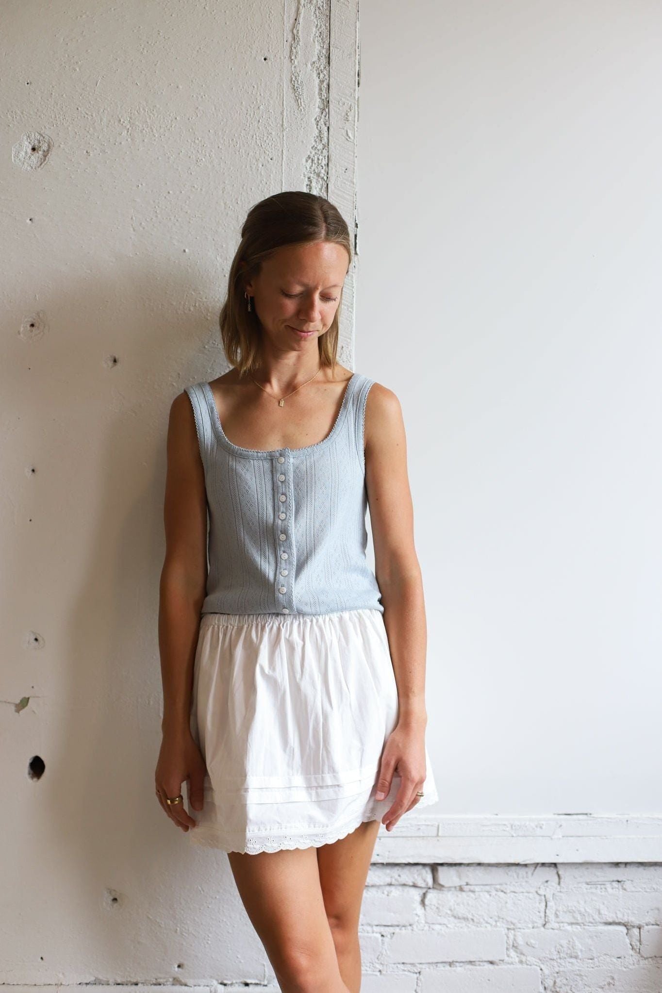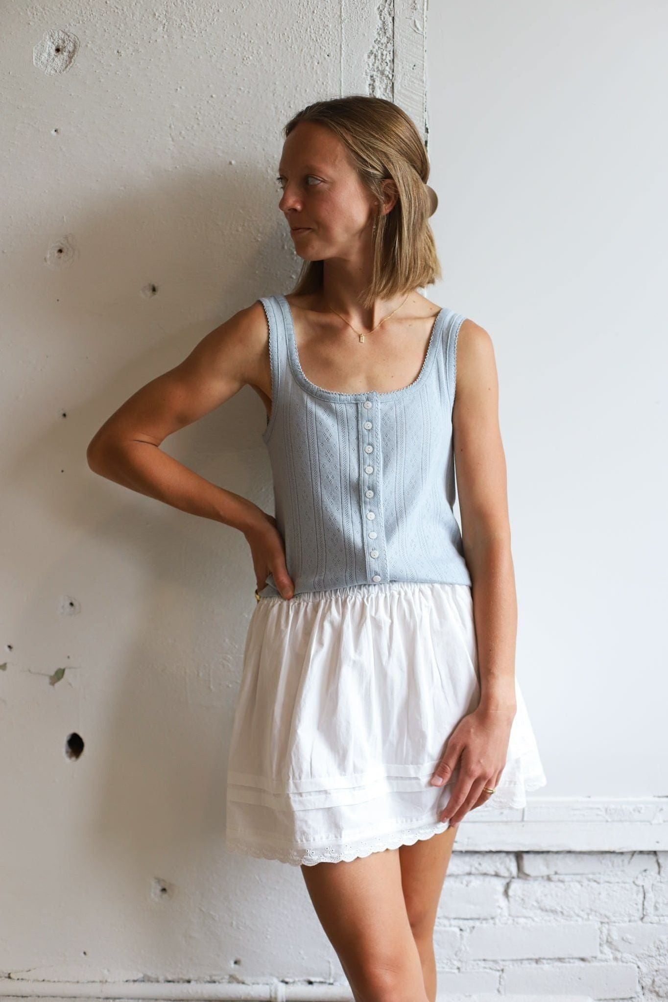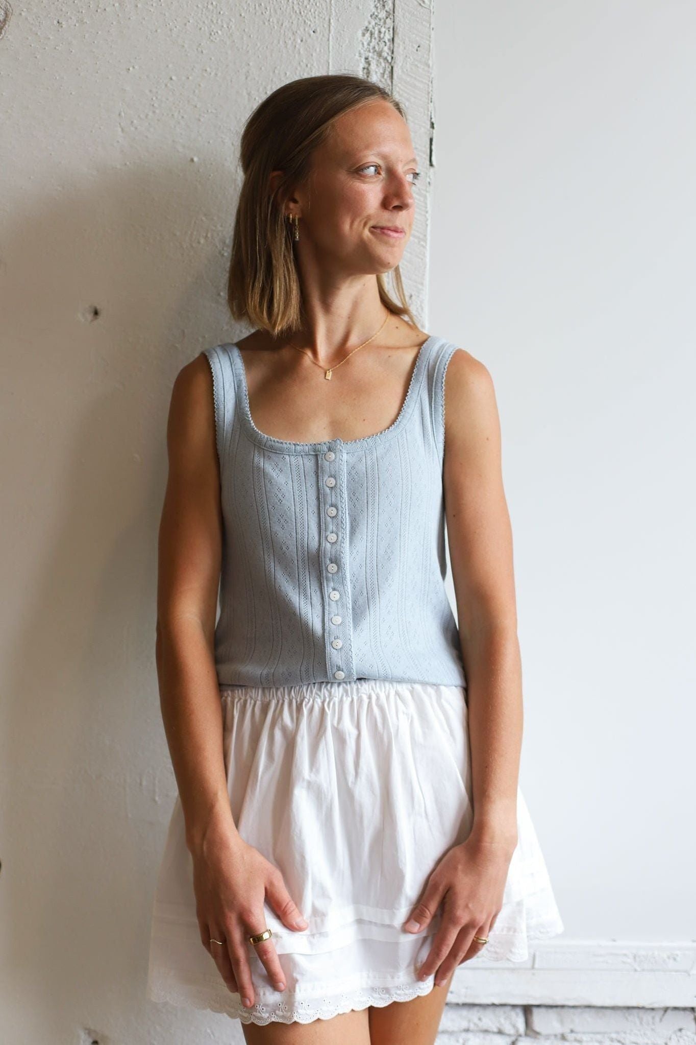 Knit Cotton Pointelle Ribbed Lace Trim Detail Buttondown Scoop Neck Sleeveless Tank Top. Sweet and delicate great on its own or layered!
