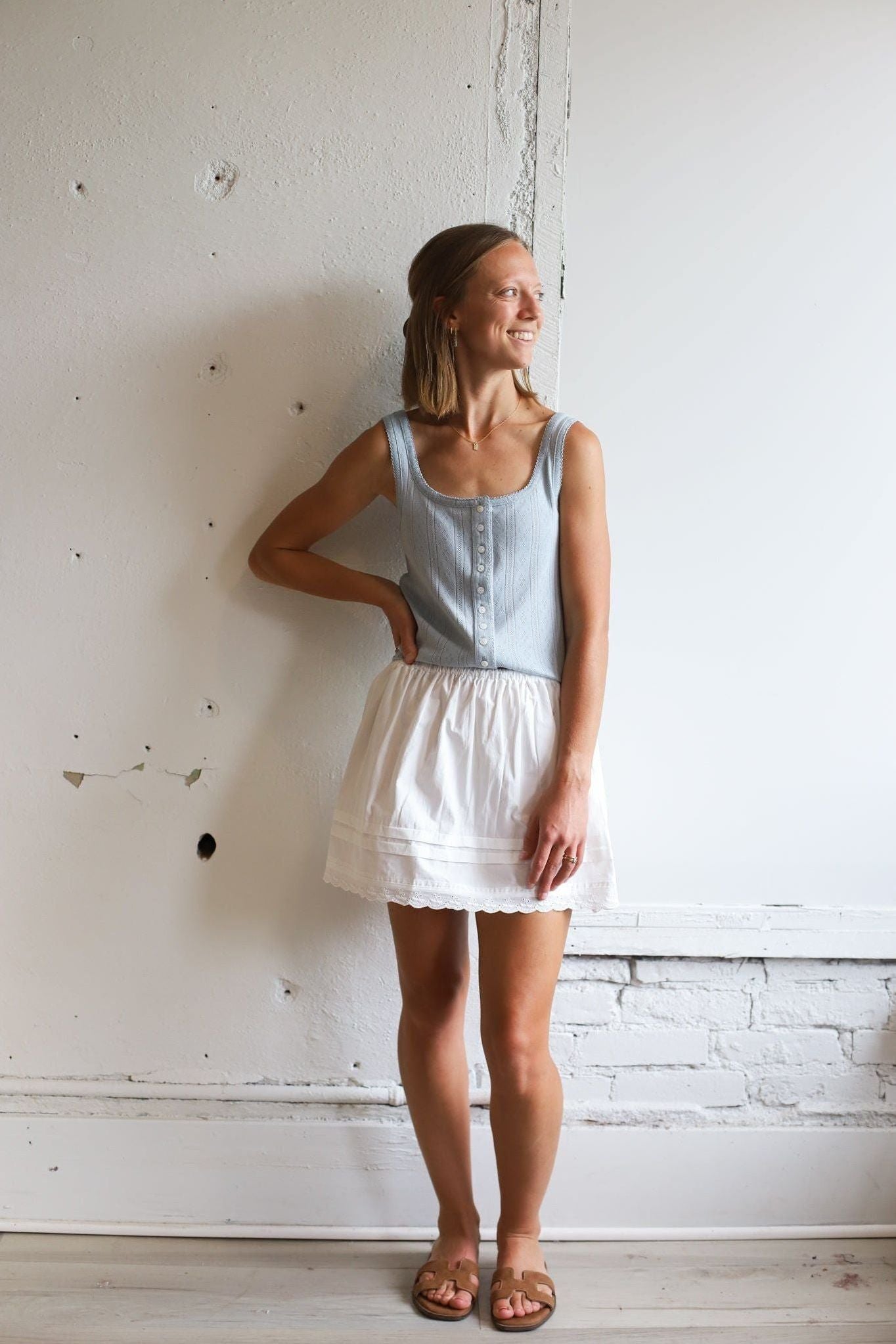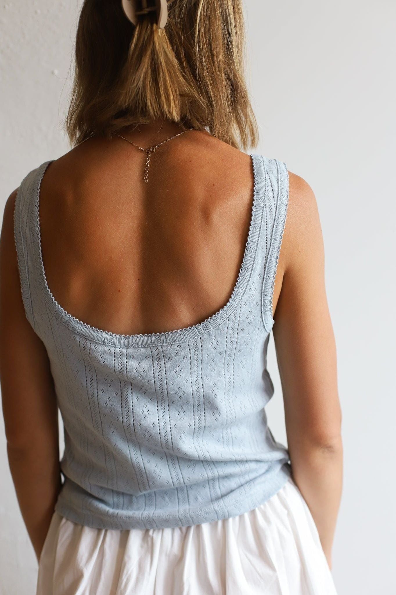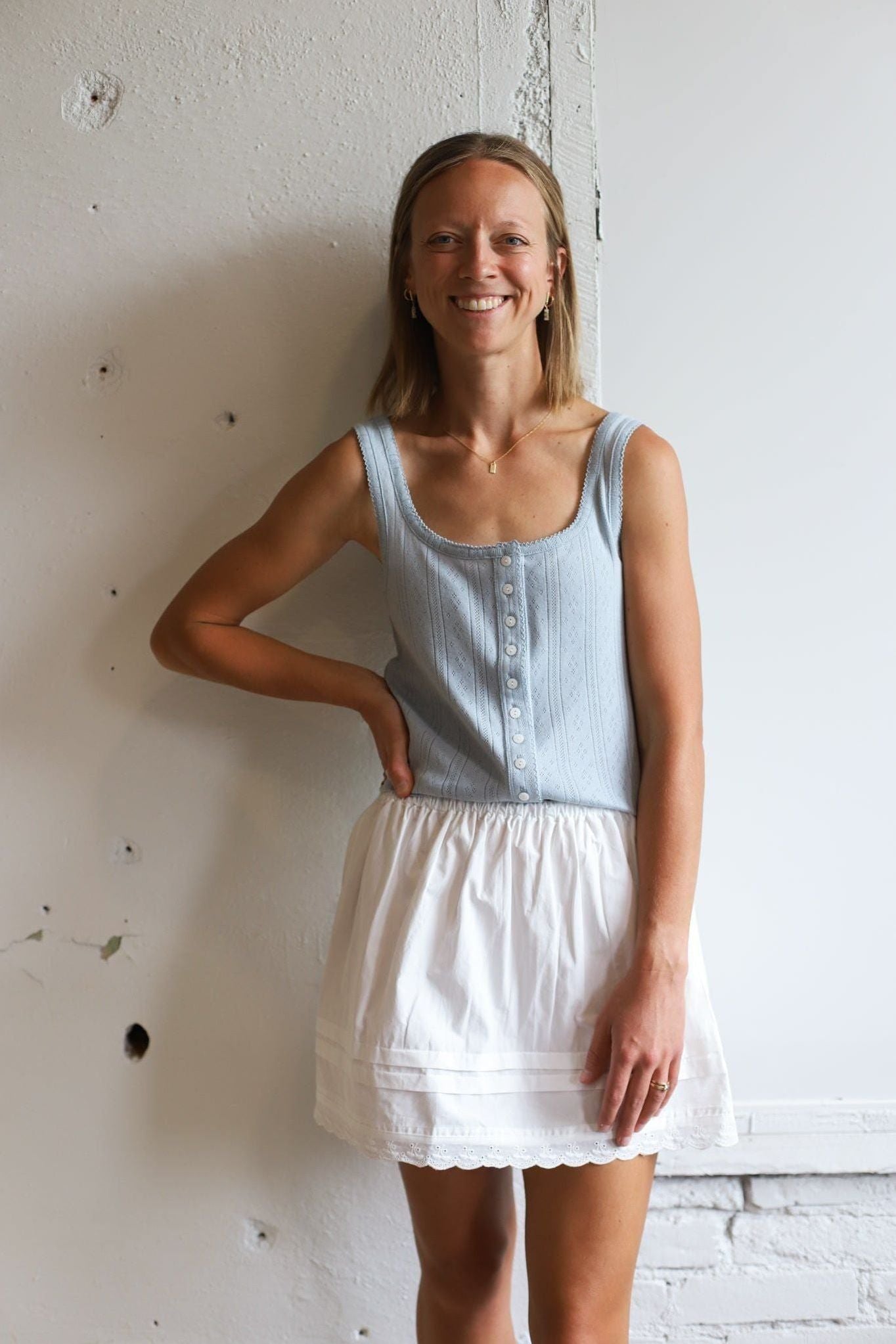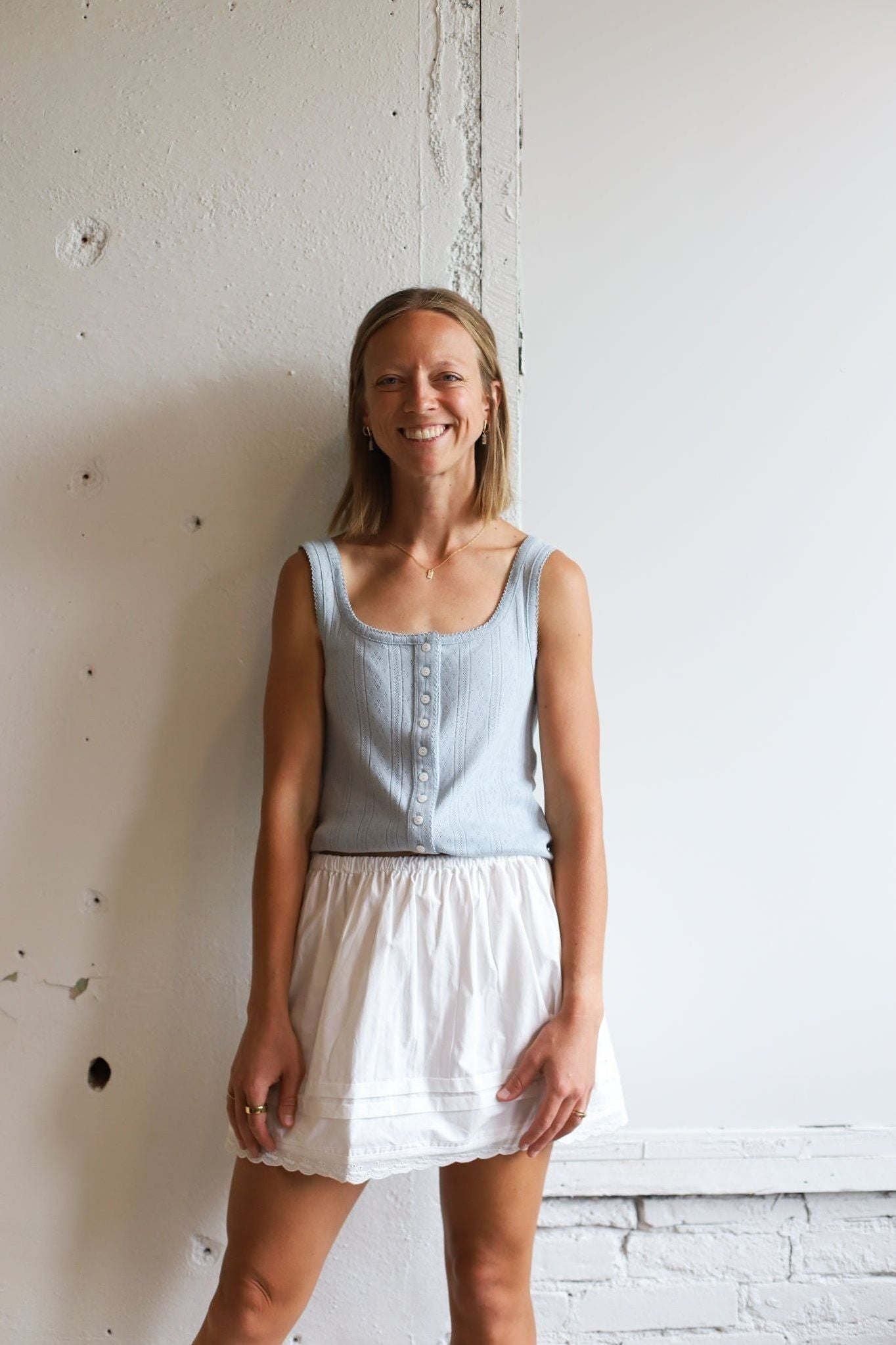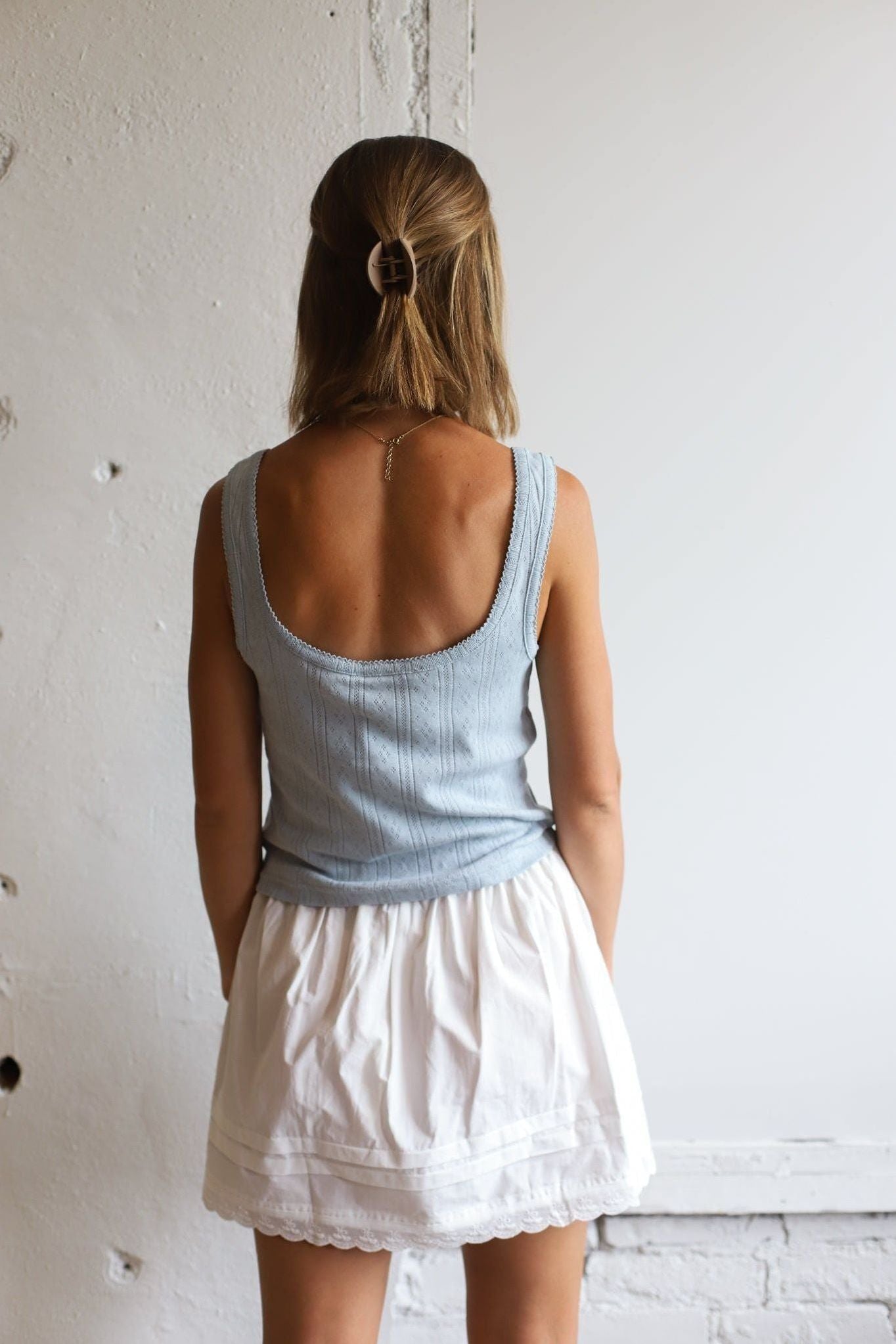 Knit Cotton Pointelle Ribbed Lace Trim Detail Buttondown Scoop Neck Sleeveless Tank Top. Sweet and delicate great on its own or layered!