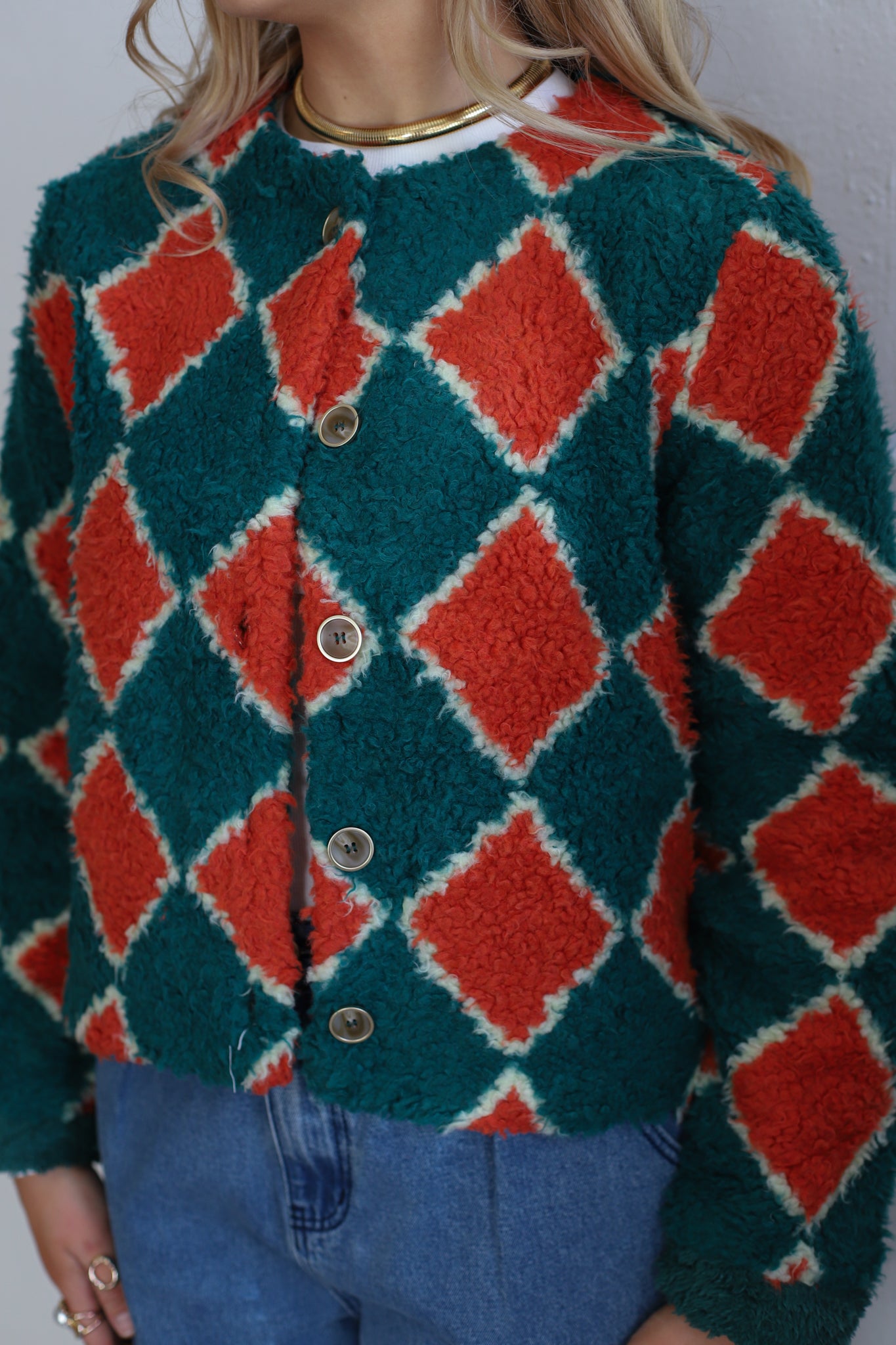 The Lottie Jacket is a faux shearling teal and orange argyle jacket that features a round neckline with decorative gold trim buttons in the front! This jacket is the perfect way to add a pop of color into your wardrobe for the colder months!