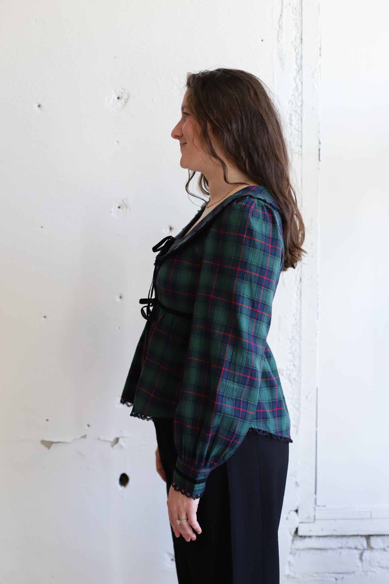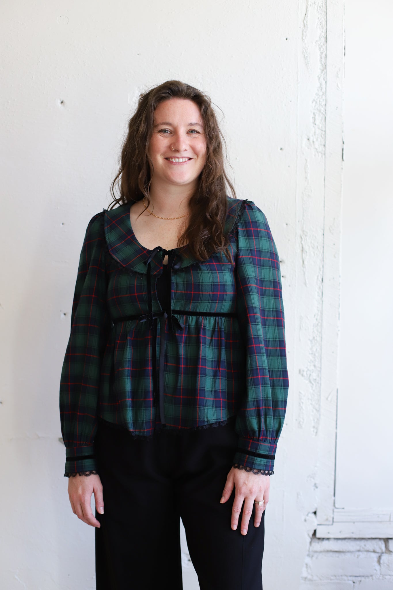 The Oh Night Blouse is the perfect holiday top! The soft and breathable fabric is perfect for layering or wearing on its own! The oversized statement collar and long puff sleeves, both trimmed with velvet, makes for a wonderful festive touch! The blouse also features velvet ribbons ties in the front, and a flowy body with a slightly cinched waistline for an easy, flattering drape!