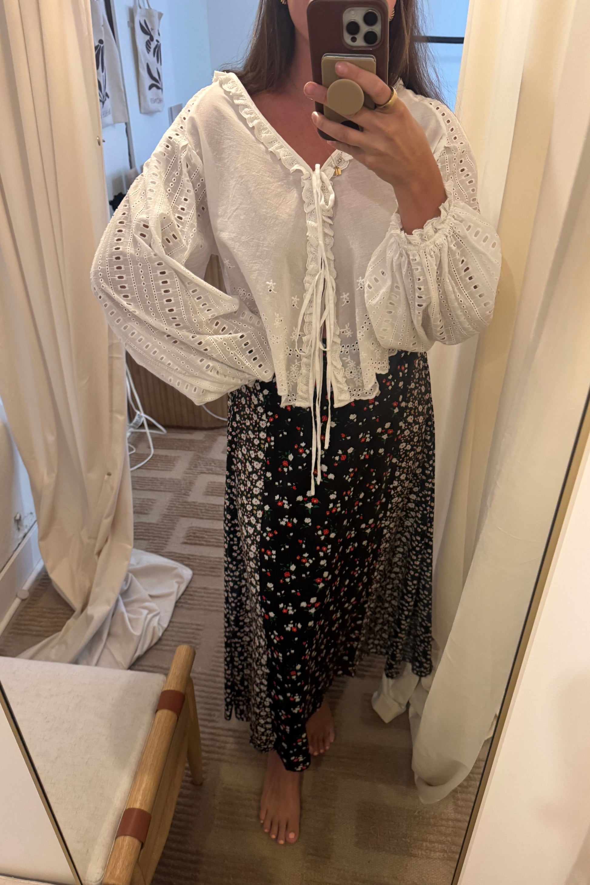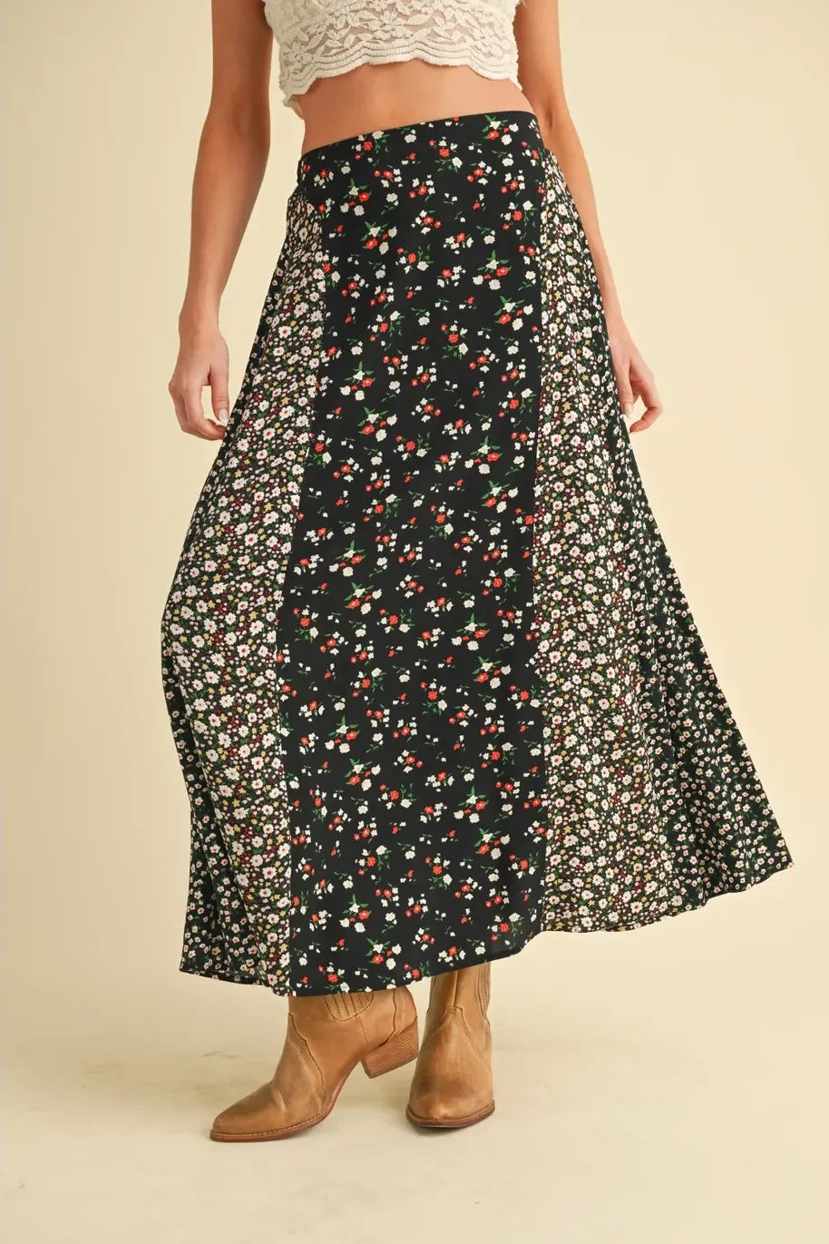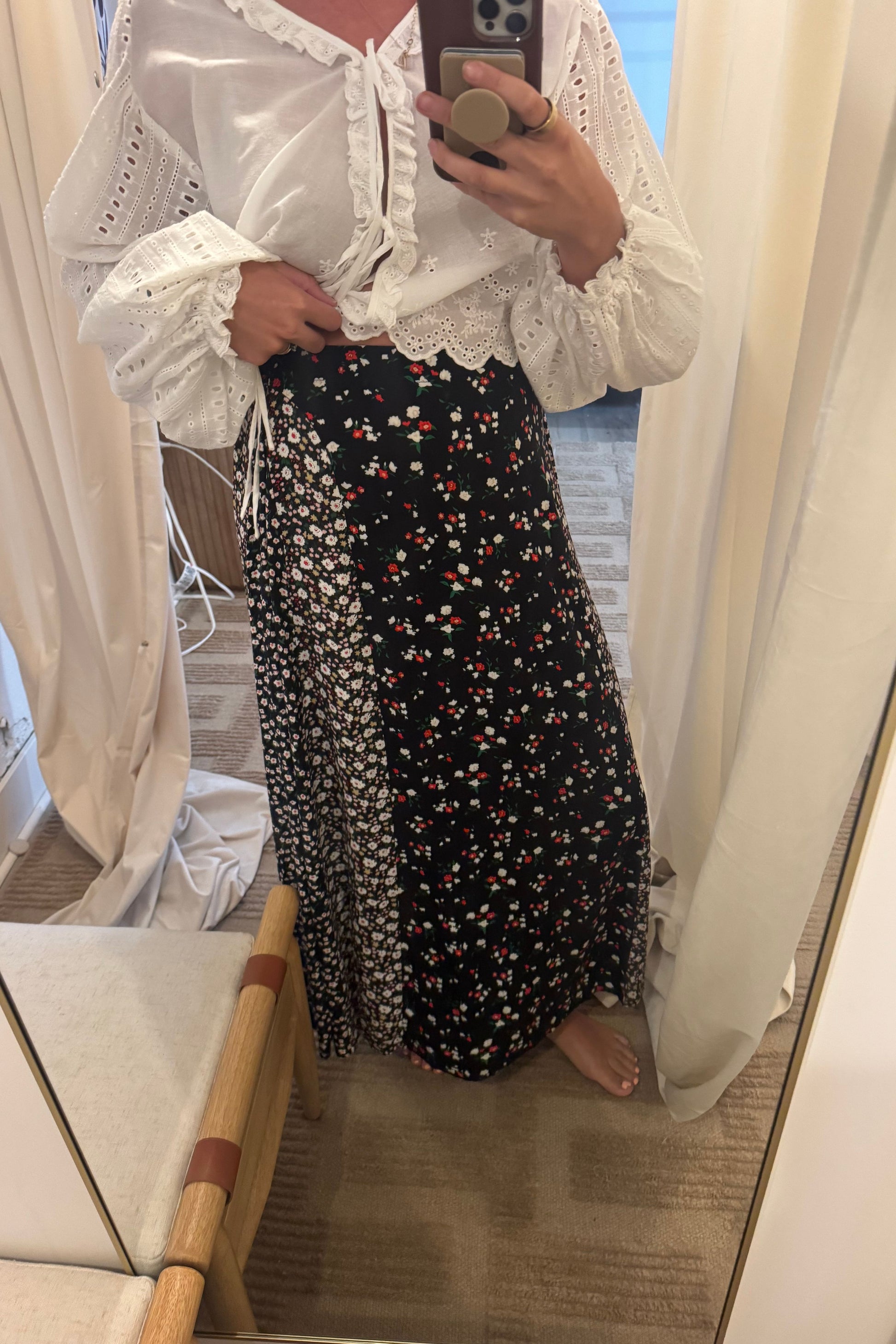 Melanie maxi skirt is crafted with a femme silhouette, contrasting floral patterns, and elasticated waistband for all-day comfort. Style with strappy sandals for your next garden party.
