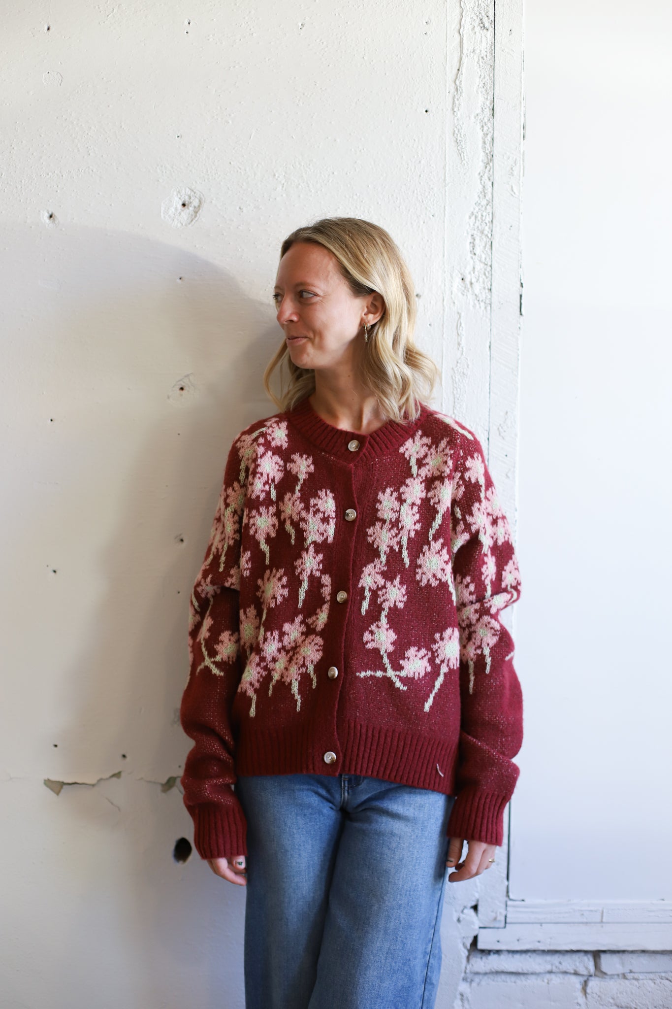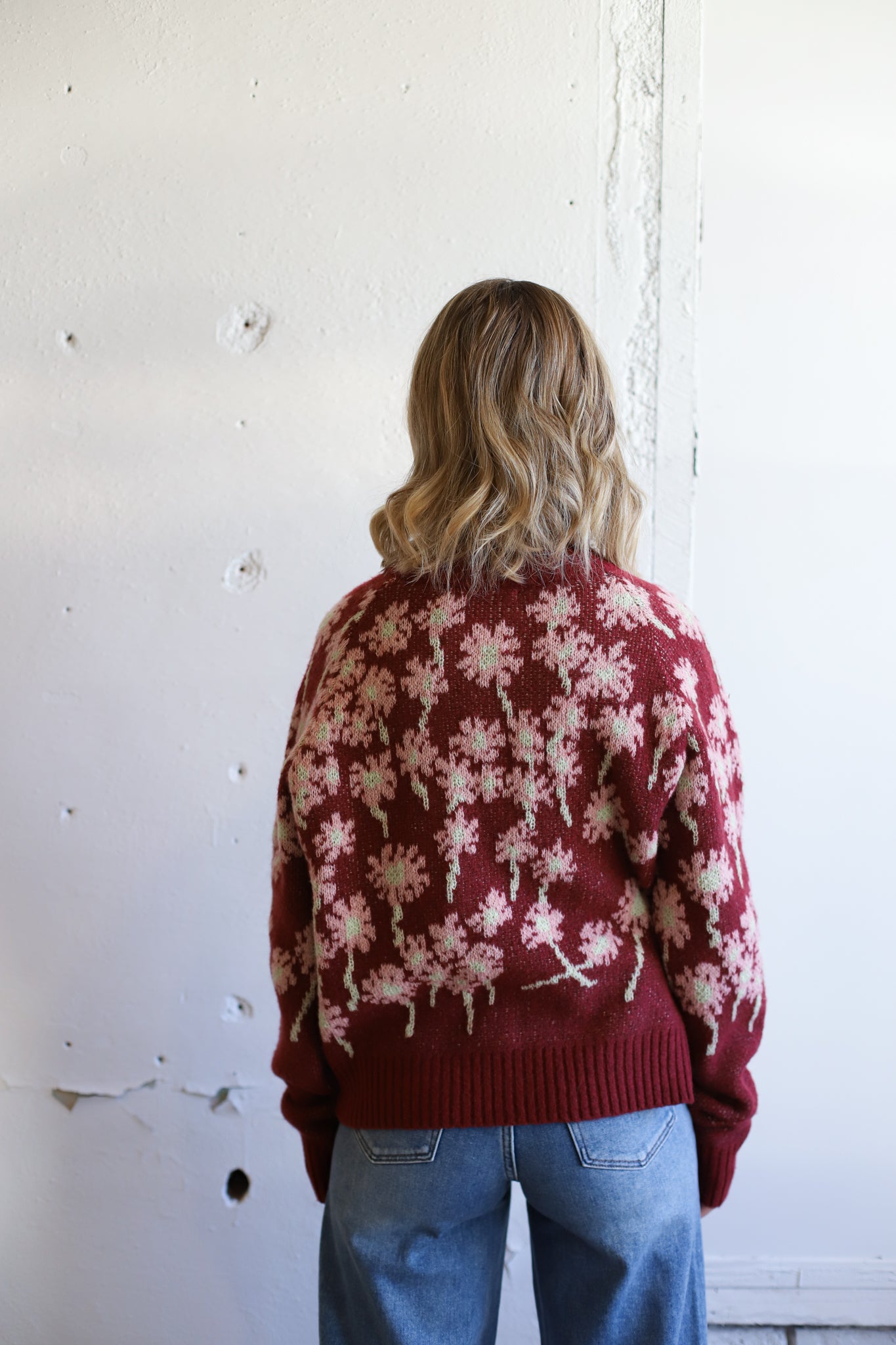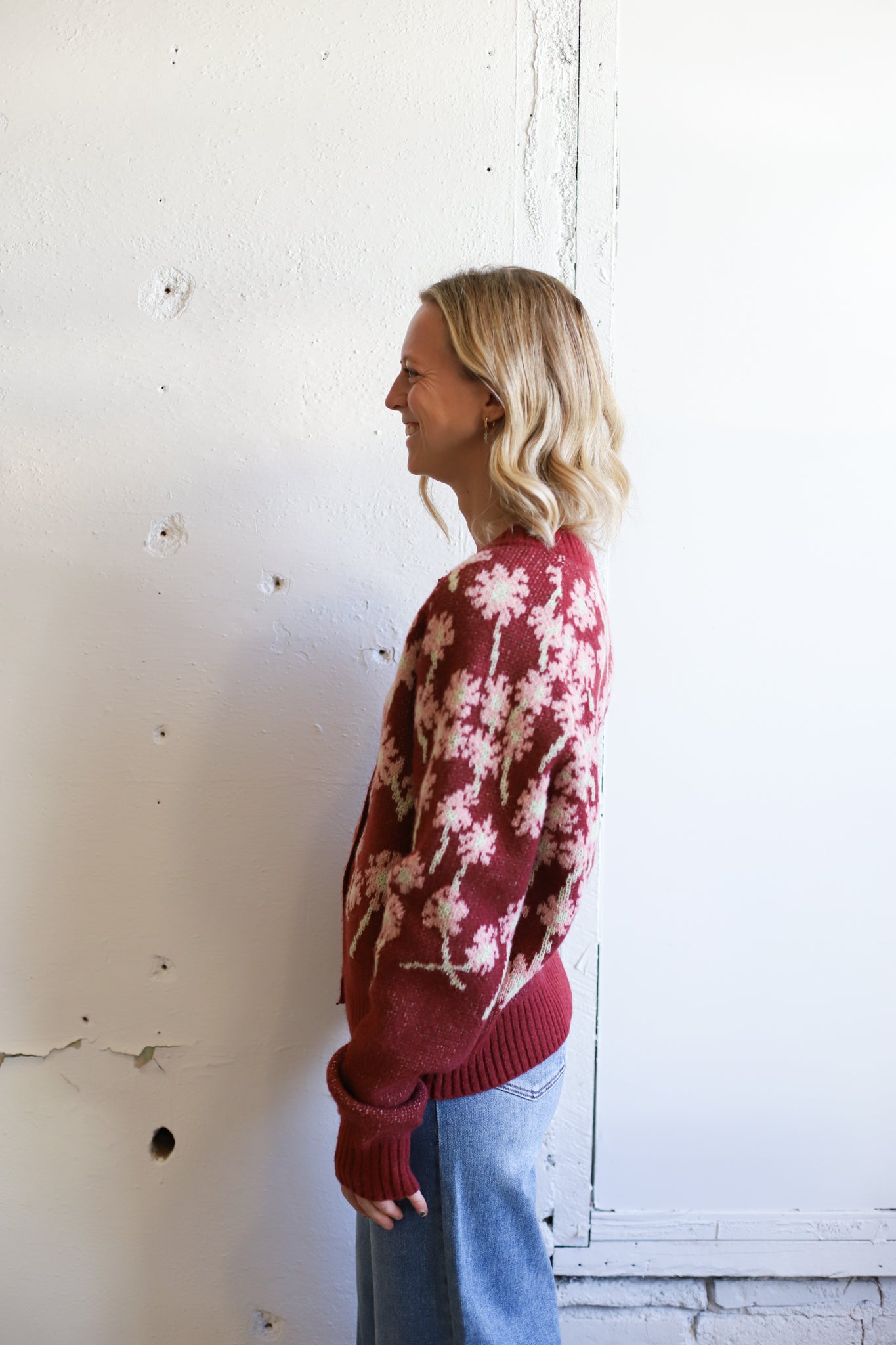 The Mulled Wine Cardi Sweater is a burgundy knit button down sweater cardigan with a floral design, a ribbed round neck, button down front, with raglan seam long sleeves, ribbed cuffs and hem and a relaxed fit!