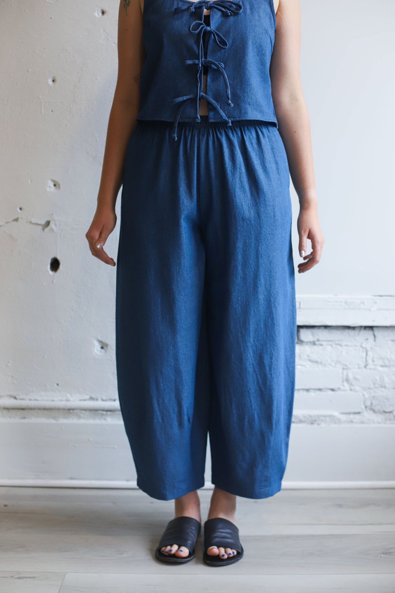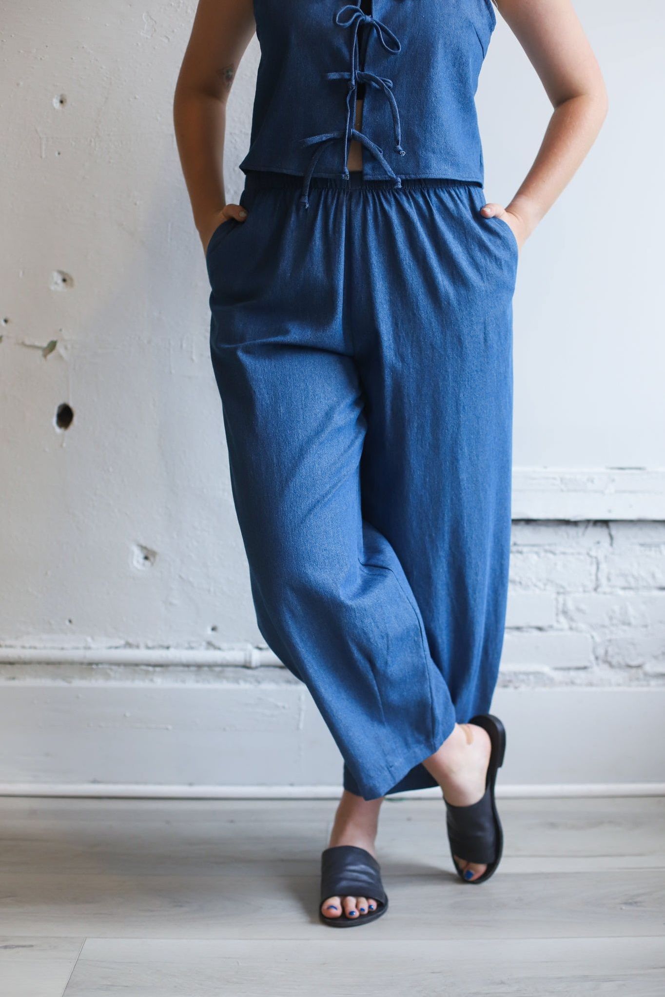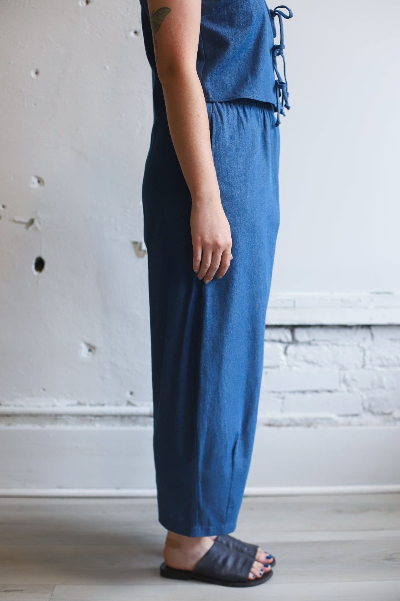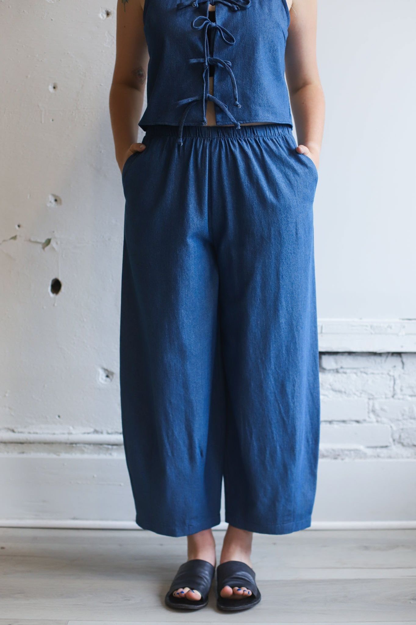Denim lantern pant with elastic waistband, side pocket, and dart detail at hem