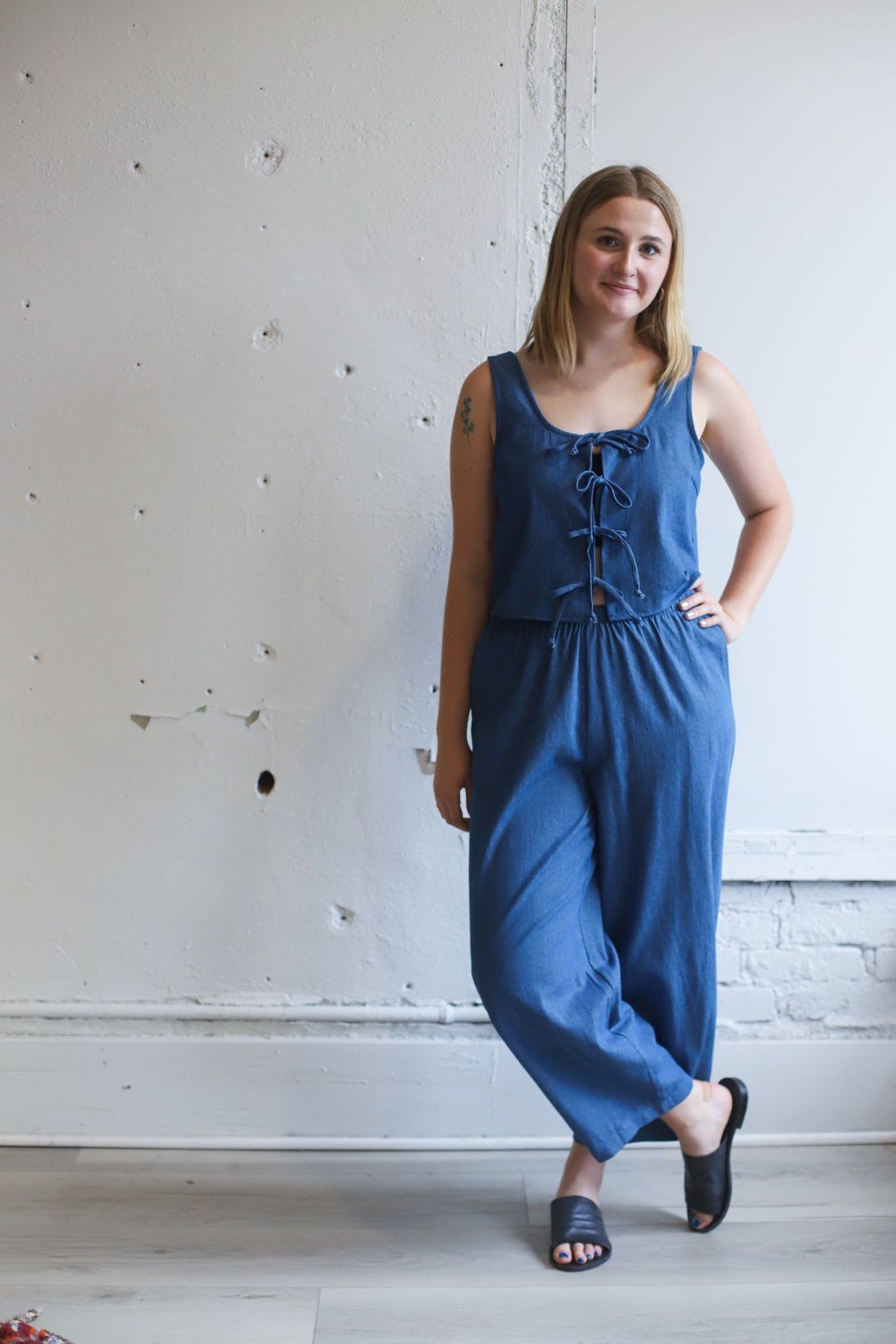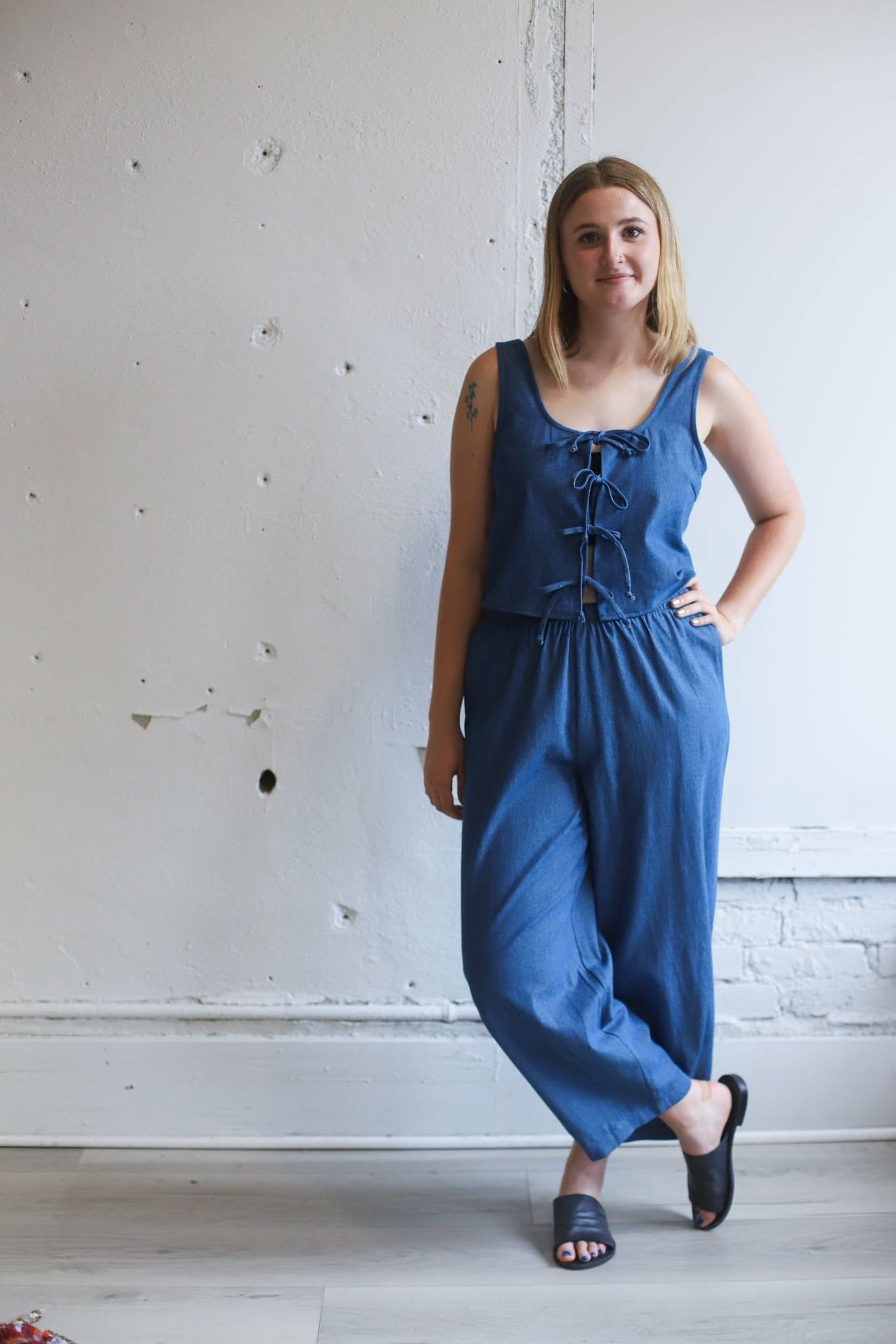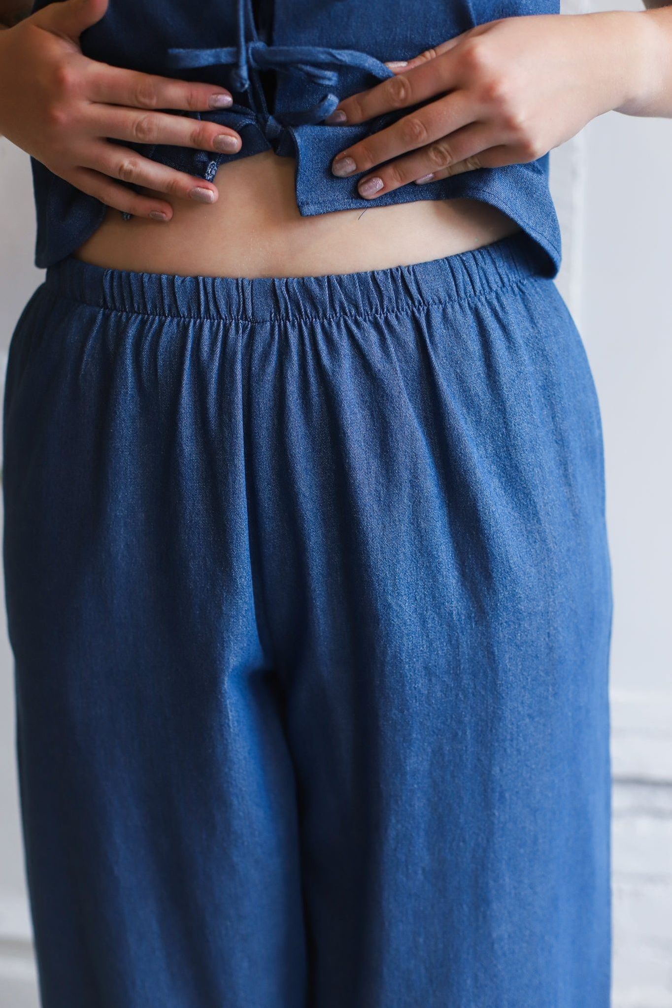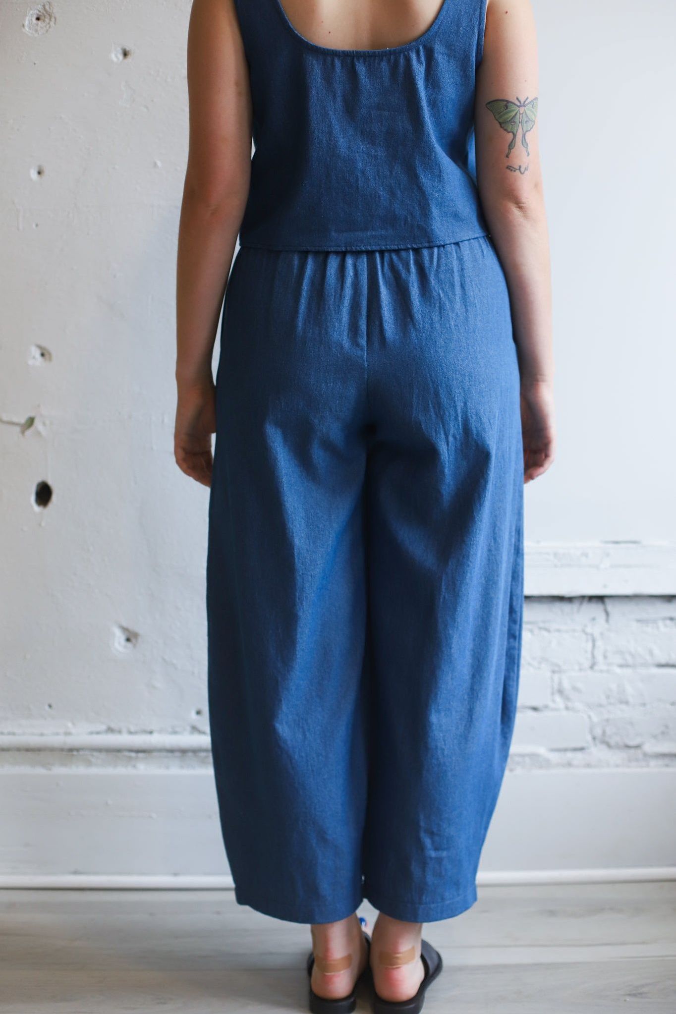 Denim lantern pant with elastic waistband, side pocket, and dart detail at hem