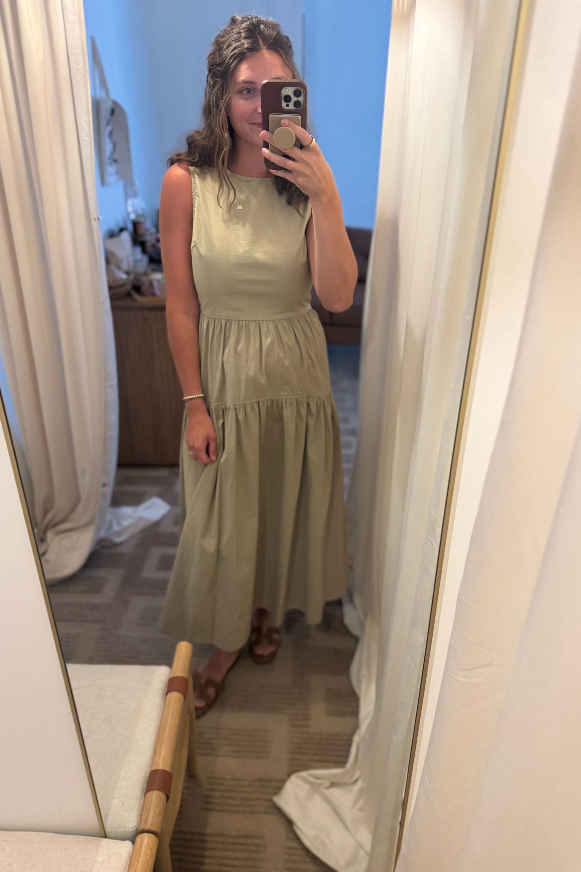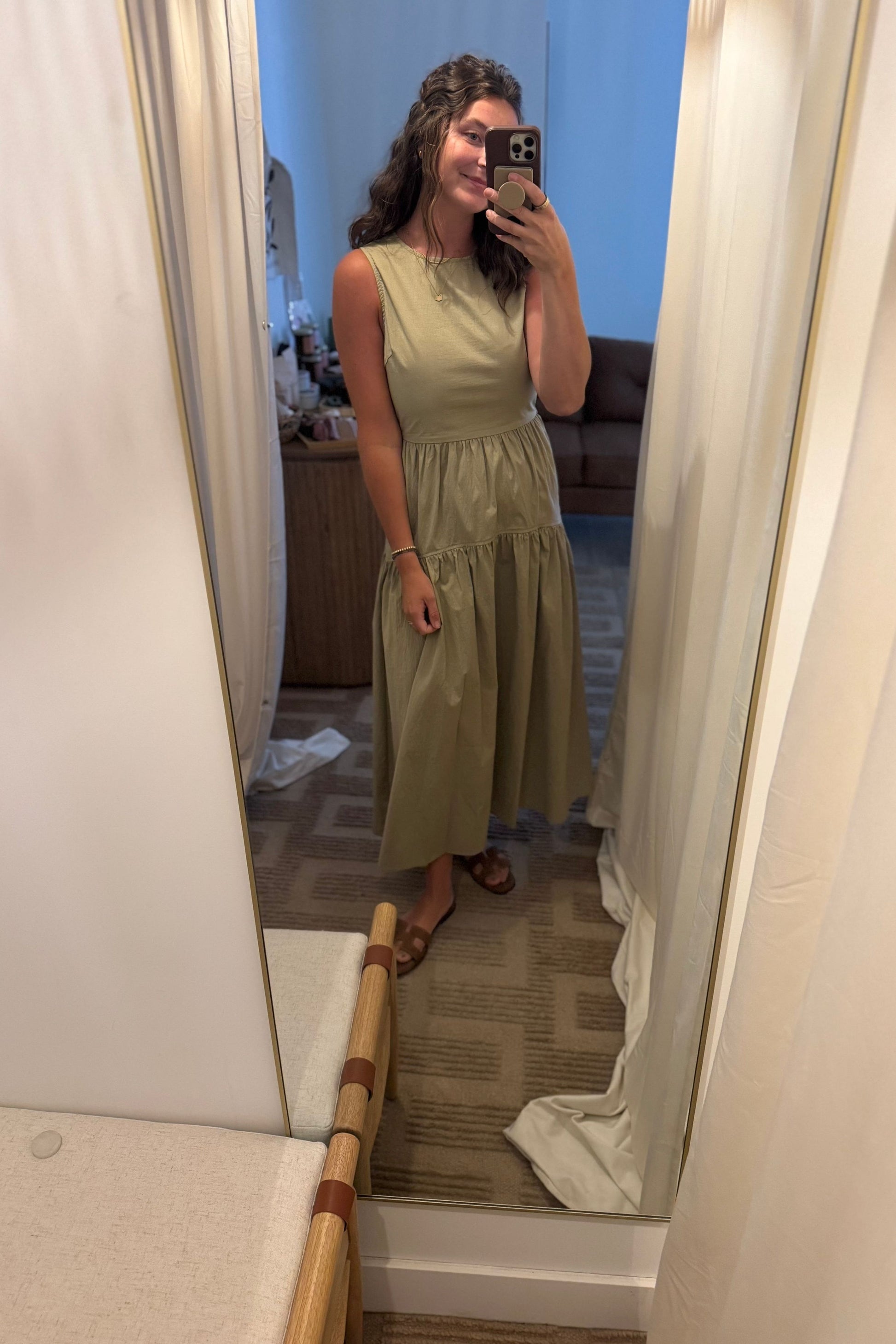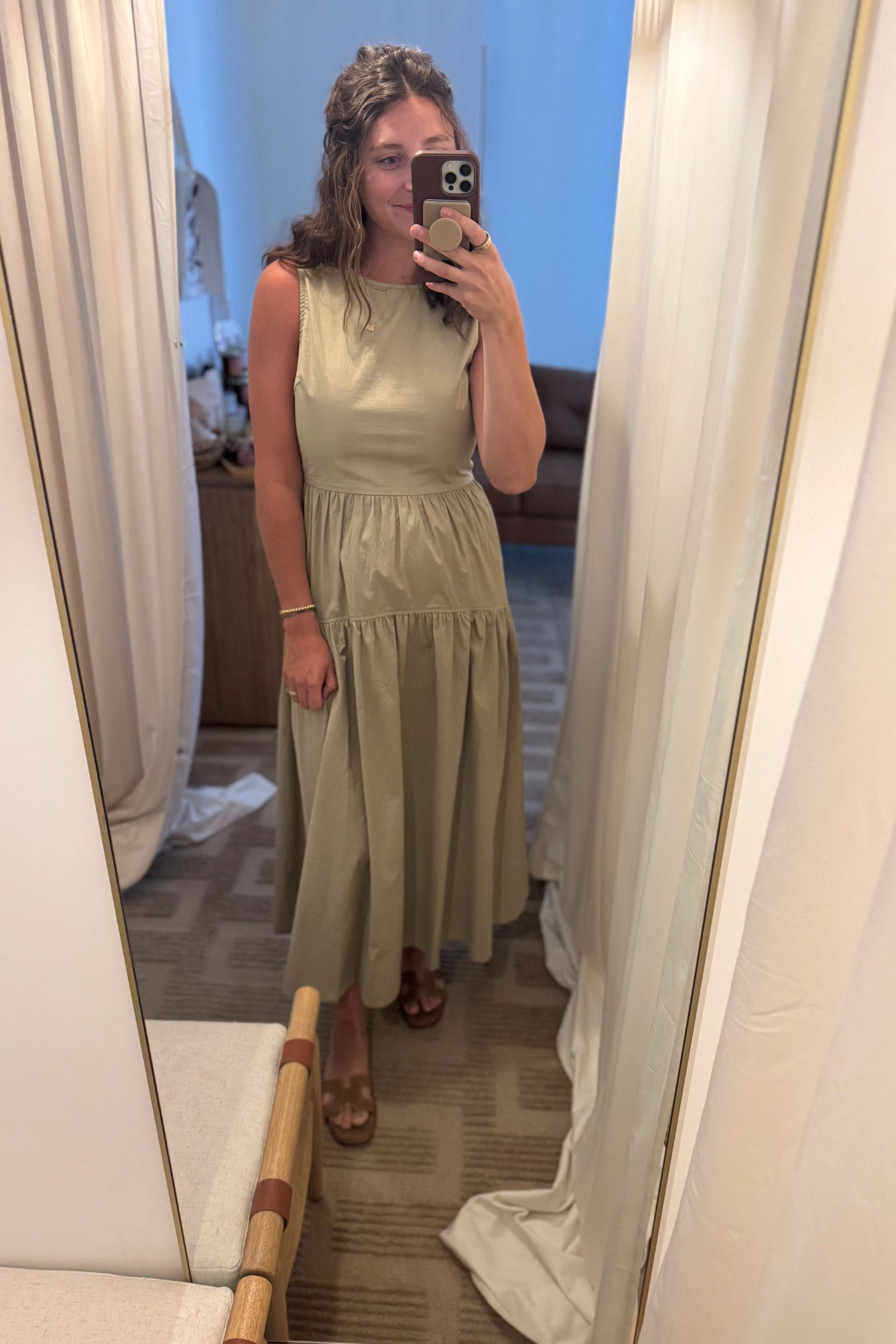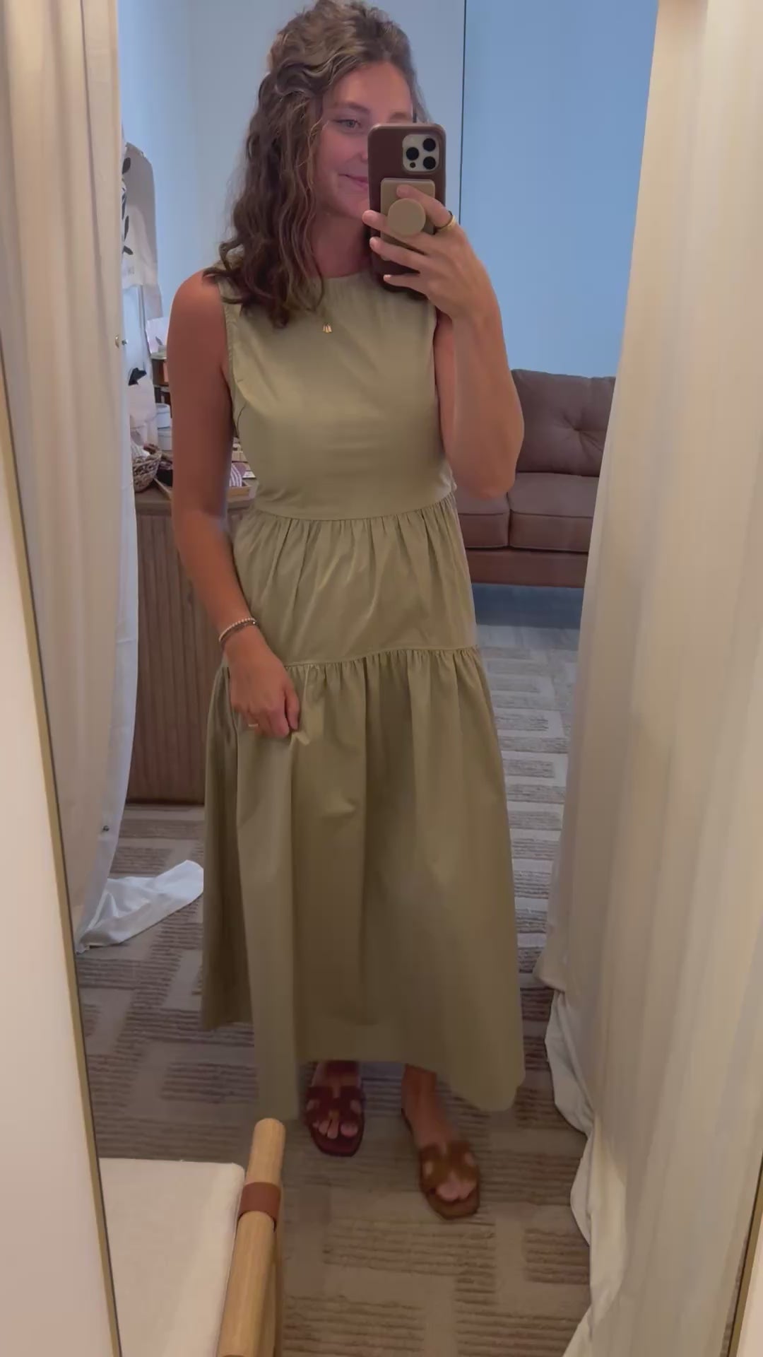Sleeveless midi dress with a classic crew neckline with fitted bodice with a softly gathered waist for a flattering silhouette. Tiered A-line skirt adds volume and movement, Crisp cotton fabric with a clean finish! Perfect for sunny days, casual outings, or vacation wear