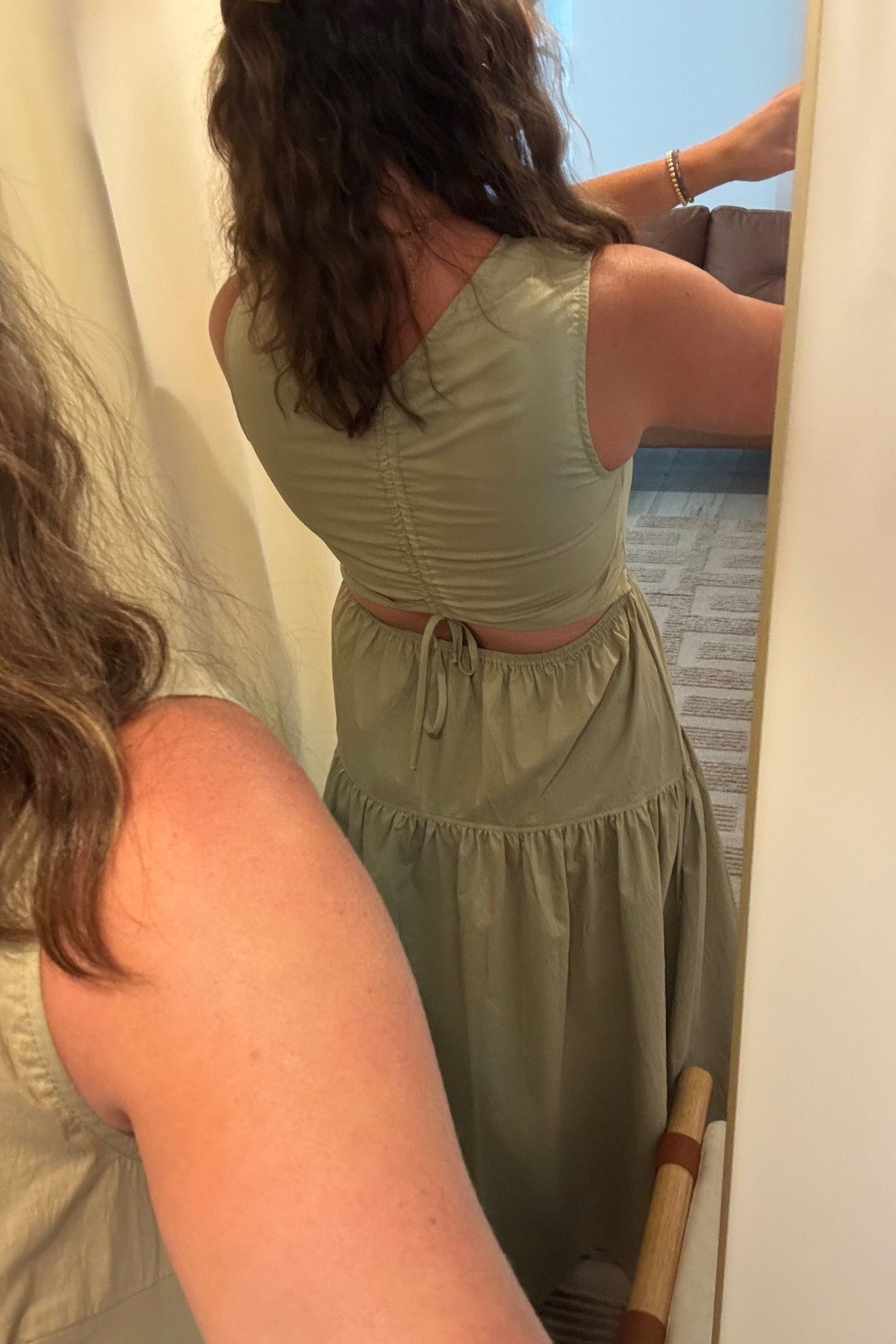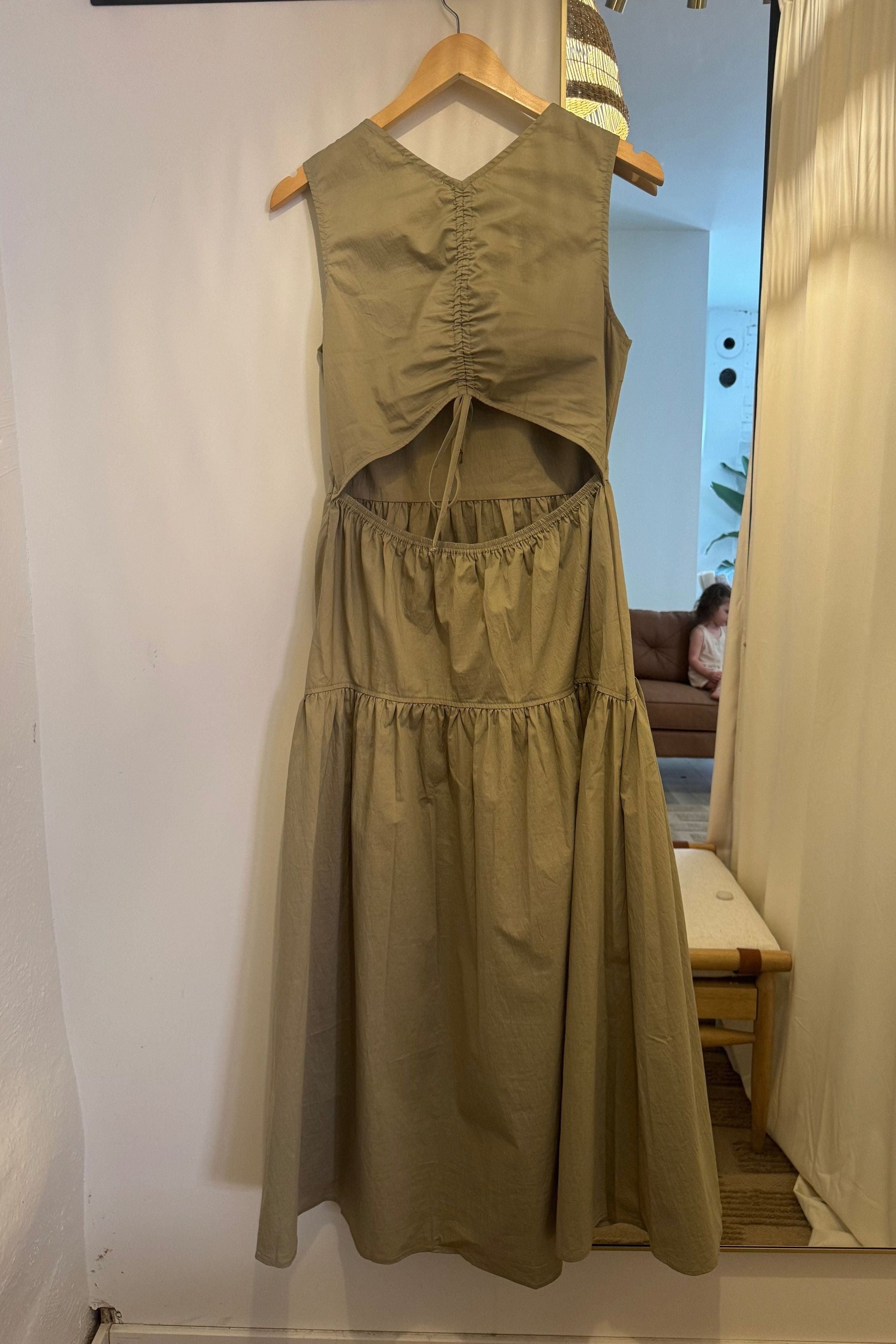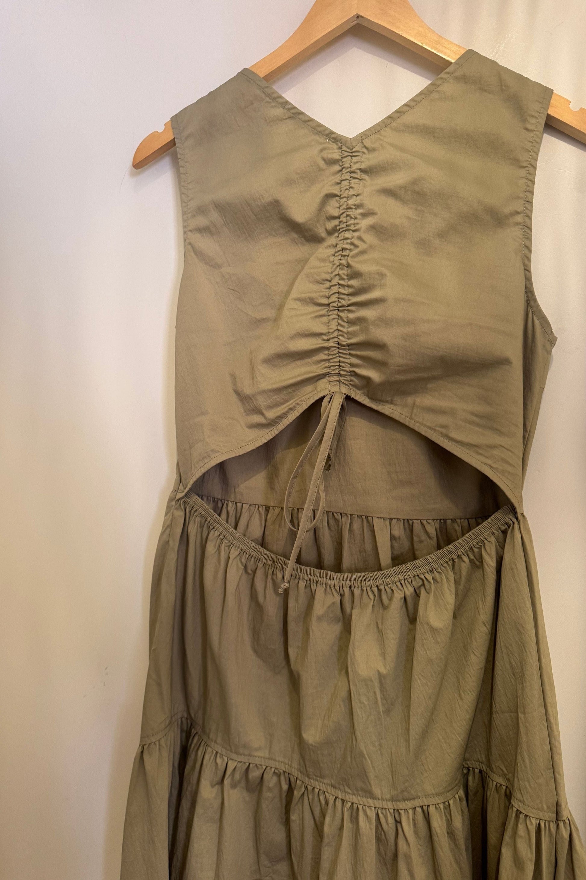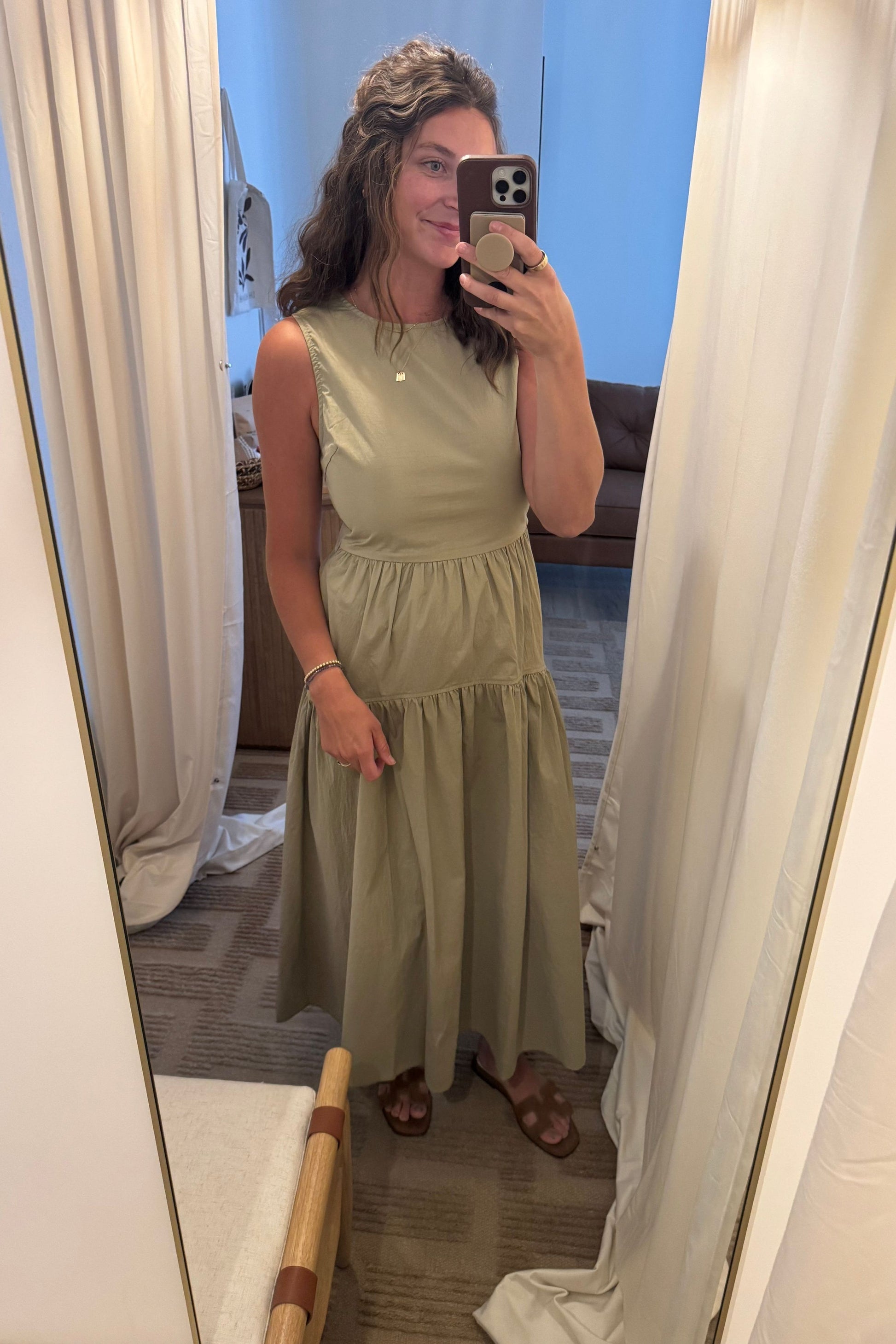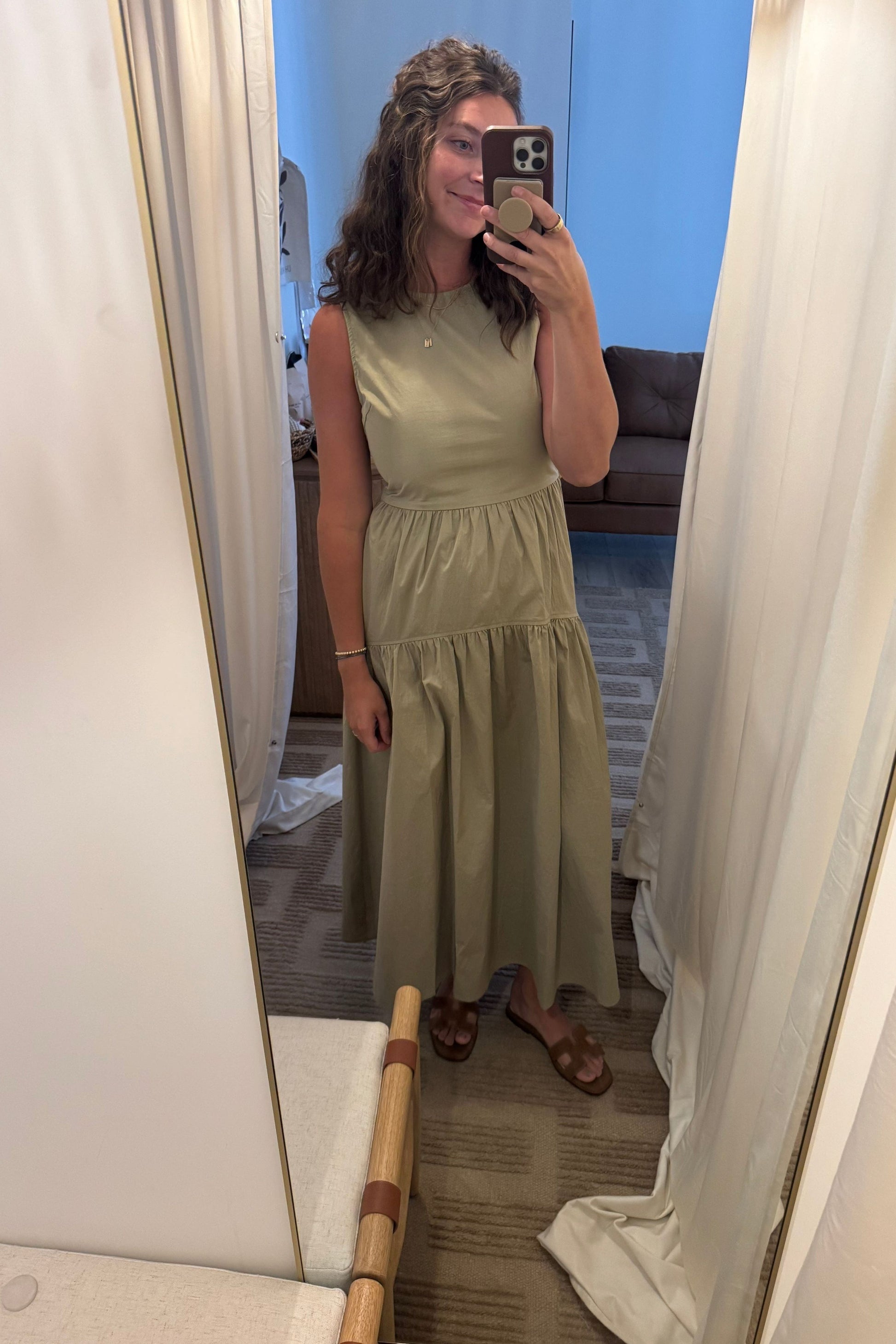Sleeveless midi dress with a classic crew neckline with fitted bodice with a softly gathered waist for a flattering silhouette. Tiered A-line skirt adds volume and movement, Crisp cotton fabric with a clean finish! Perfect for sunny days, casual outings, or vacation wear