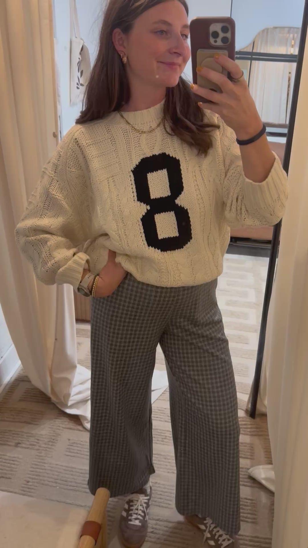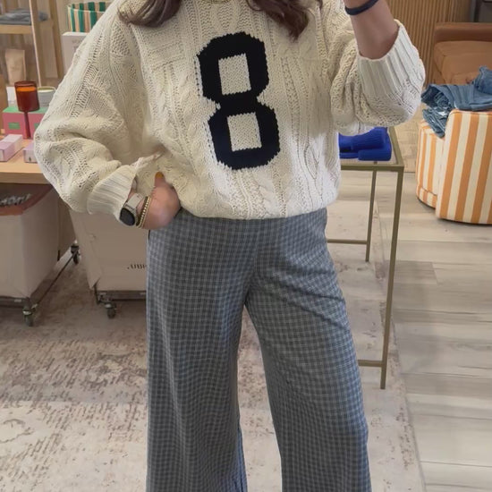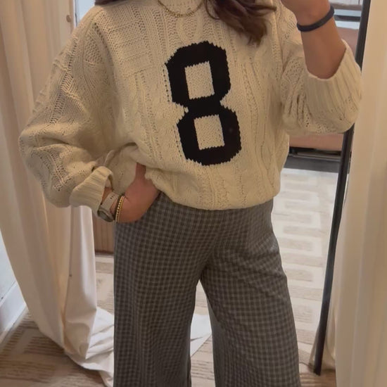 Chunky cable knit sweater featuring bold varsity-style "8" on front. Designed with mixed cable textures for a cozy, collegiate look. Soft, relaxed fit for casual everyday wear.