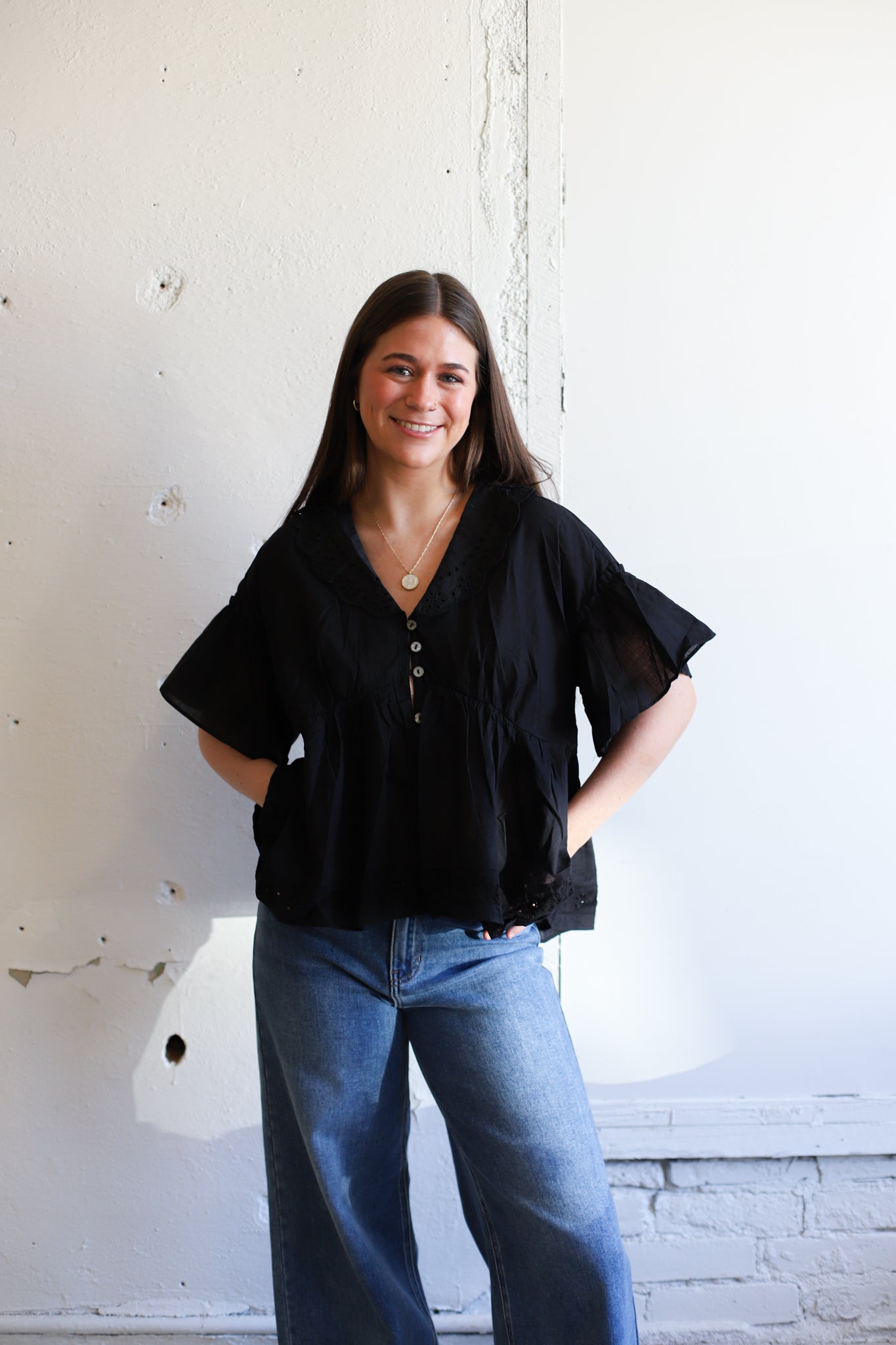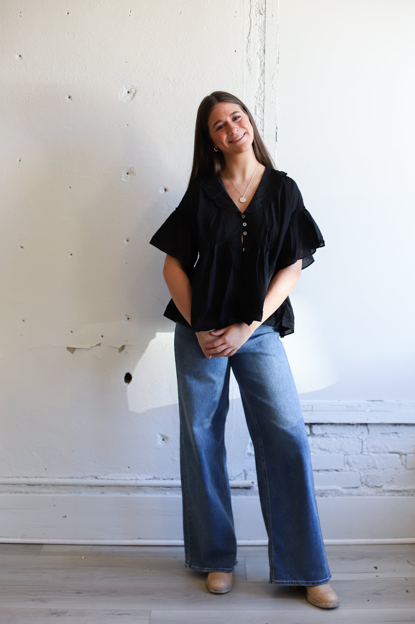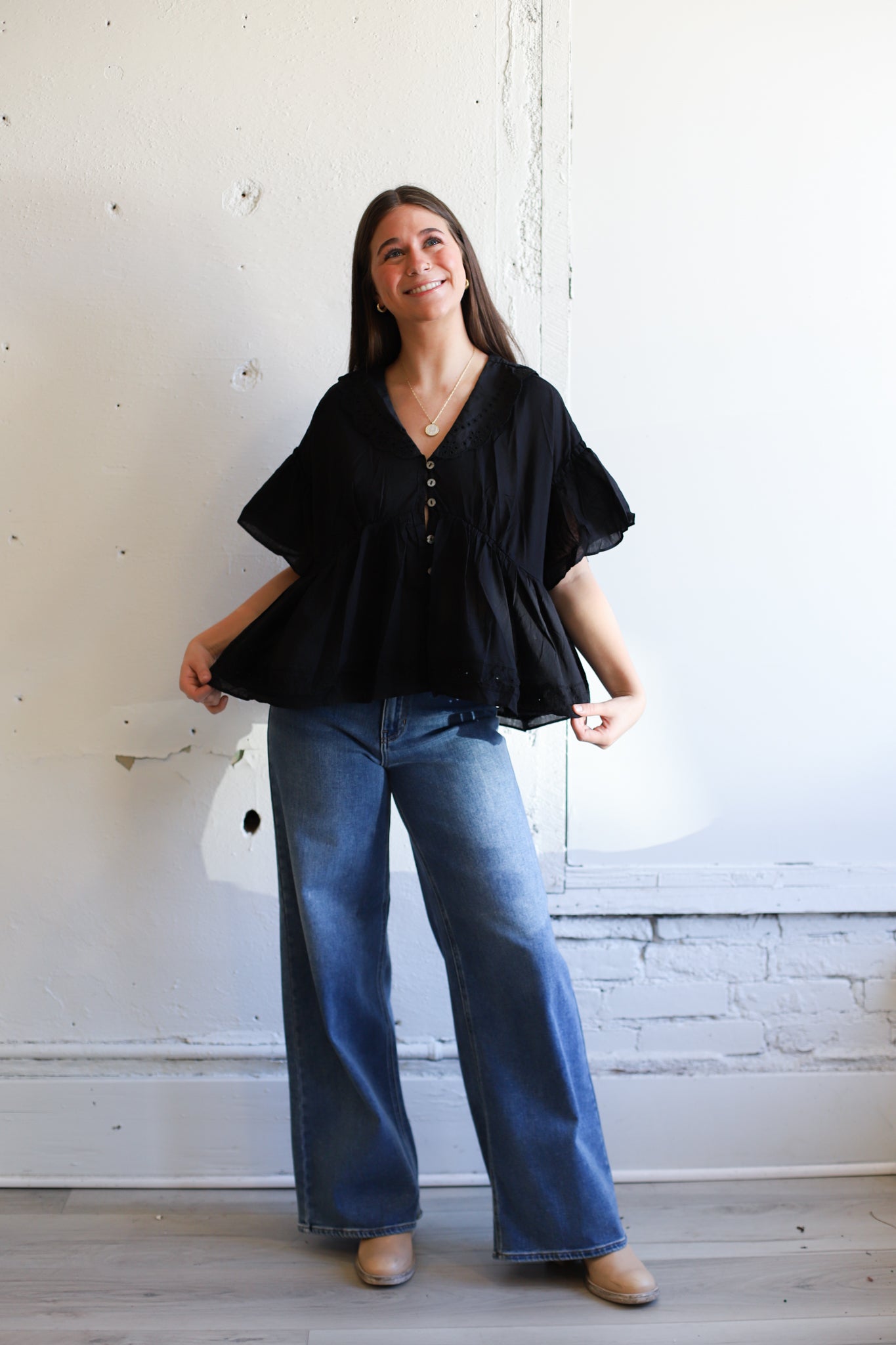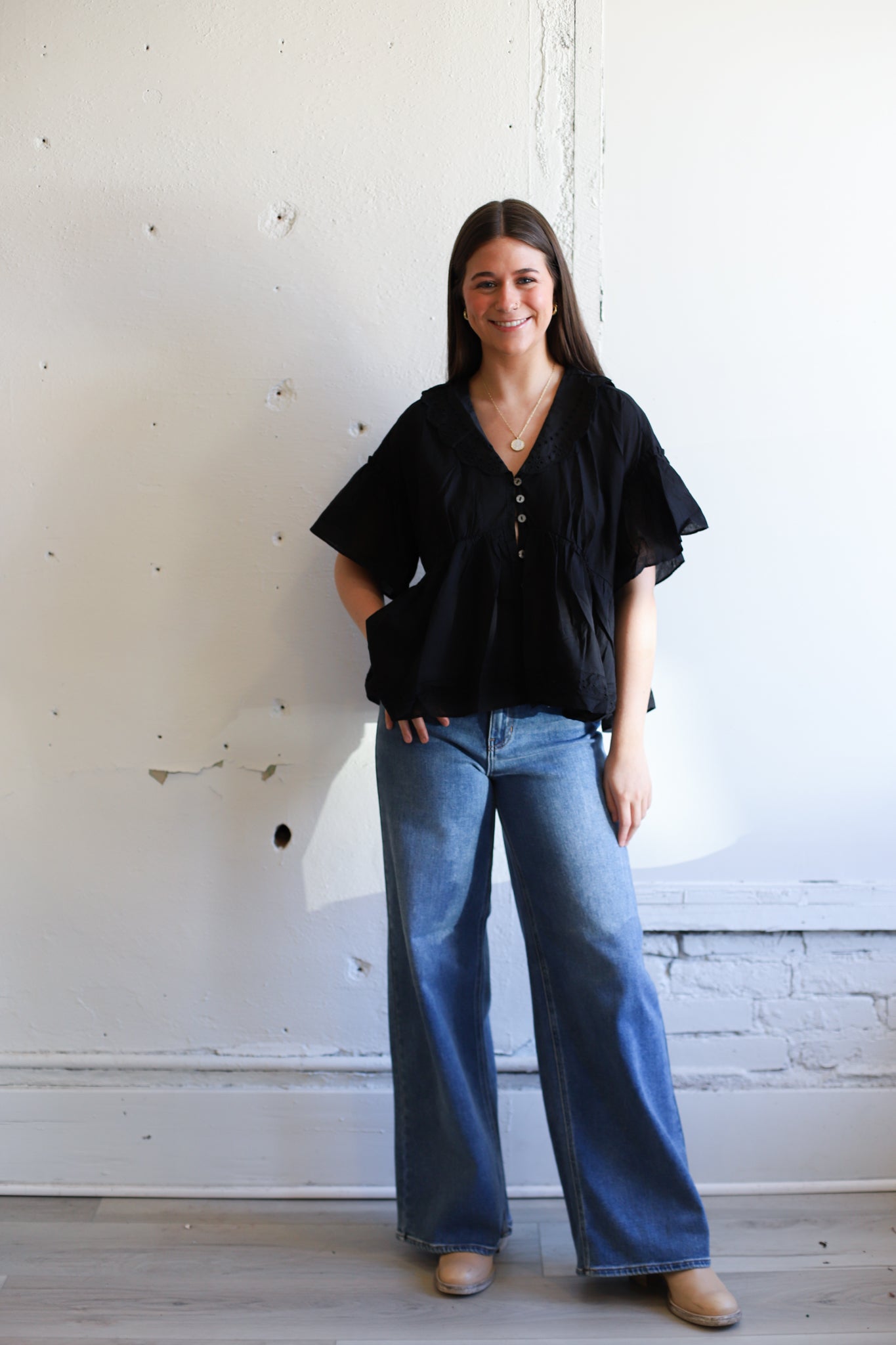 This timeless top with front button closures and a plunge neck with shawl collar is a staple for any closet! The top features elbow-length sleeves and pairs great with a pair of jeans!