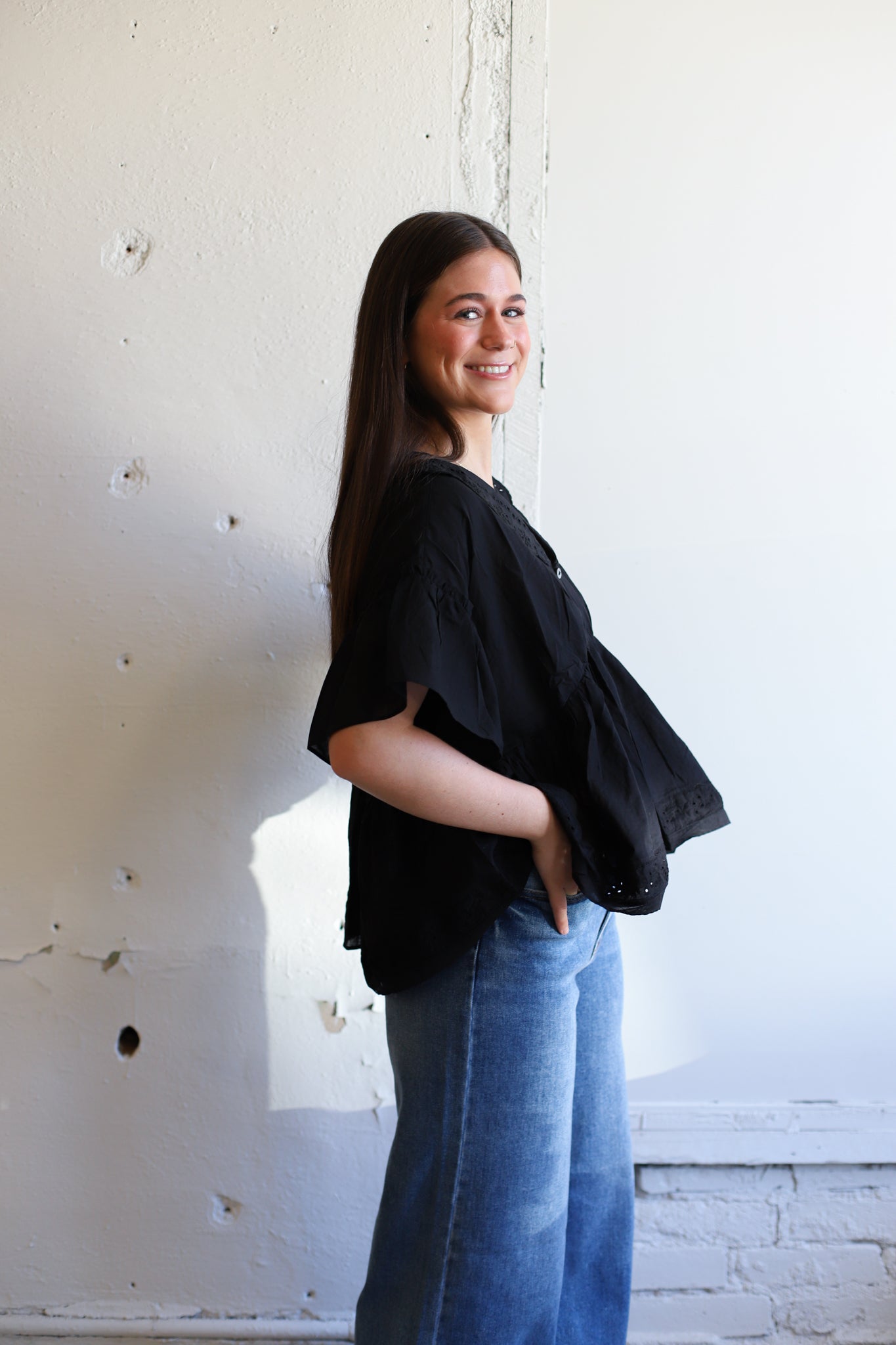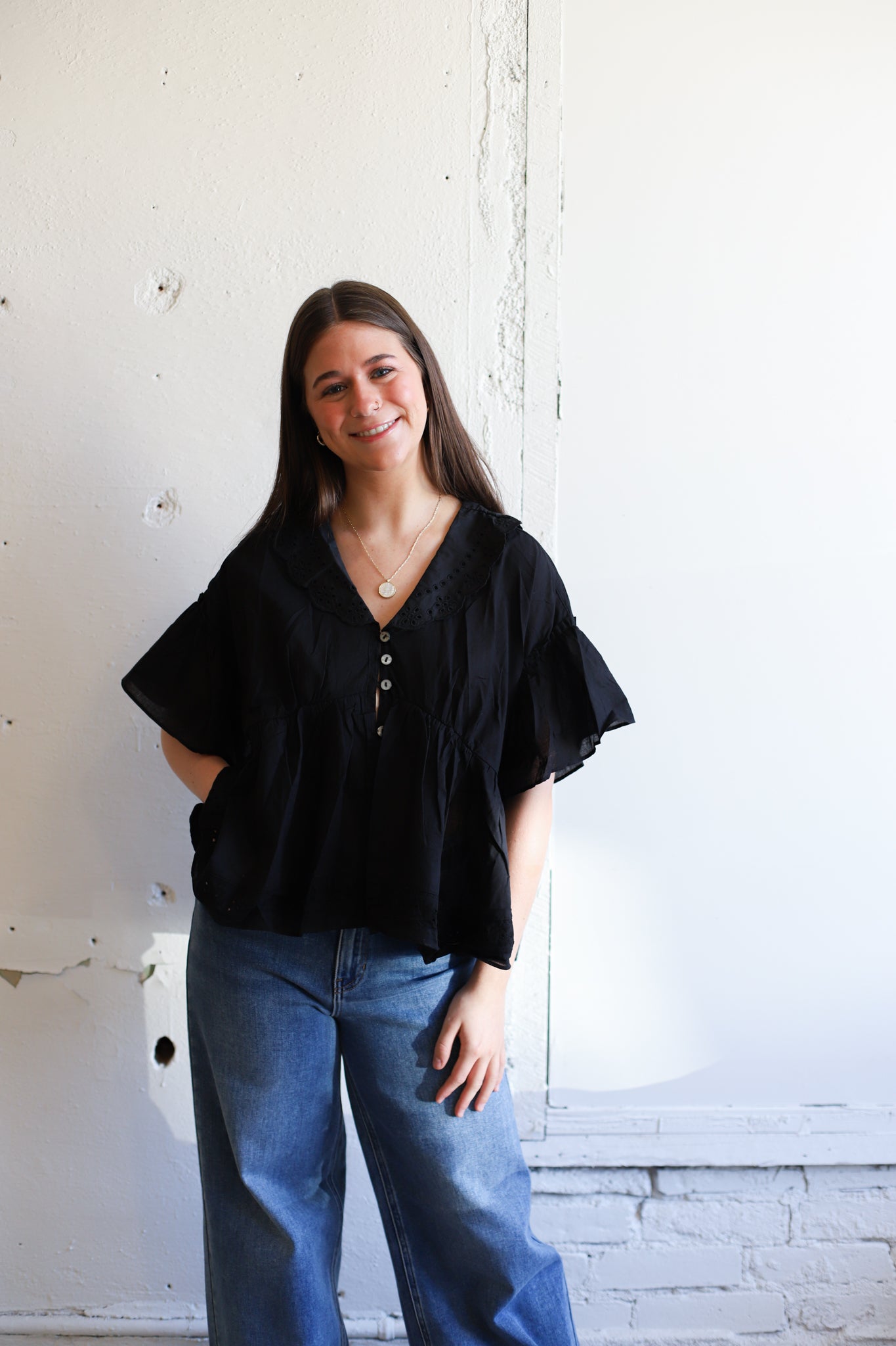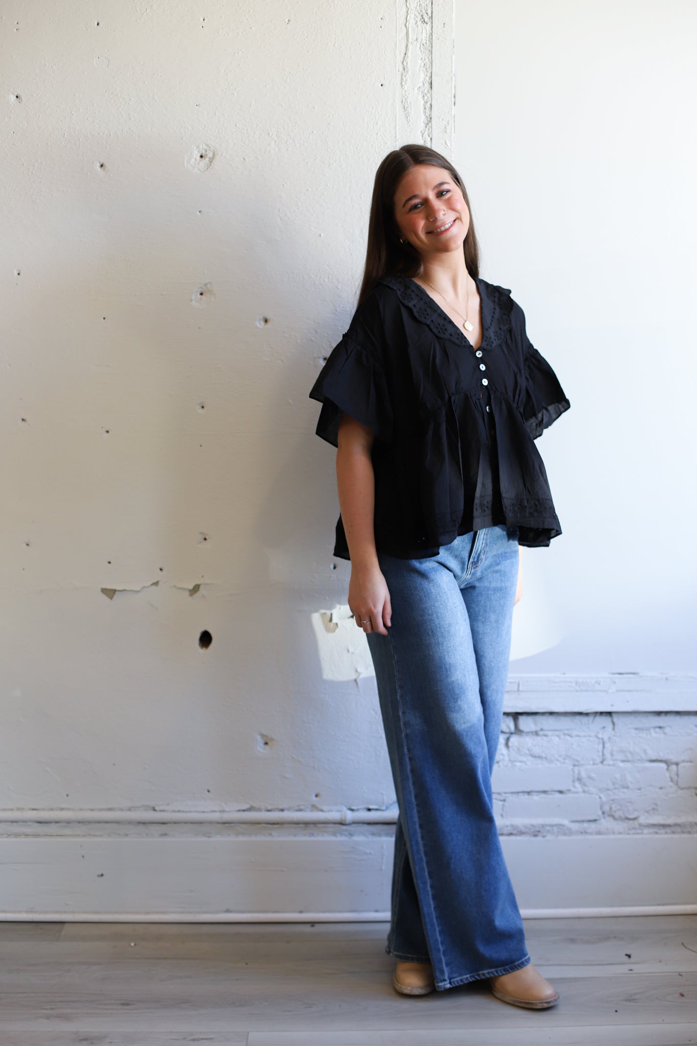 This timeless top with front button closures and a plunge neck with shawl collar is a staple for any closet! The top features elbow-length sleeves and pairs great with a pair of jeans!