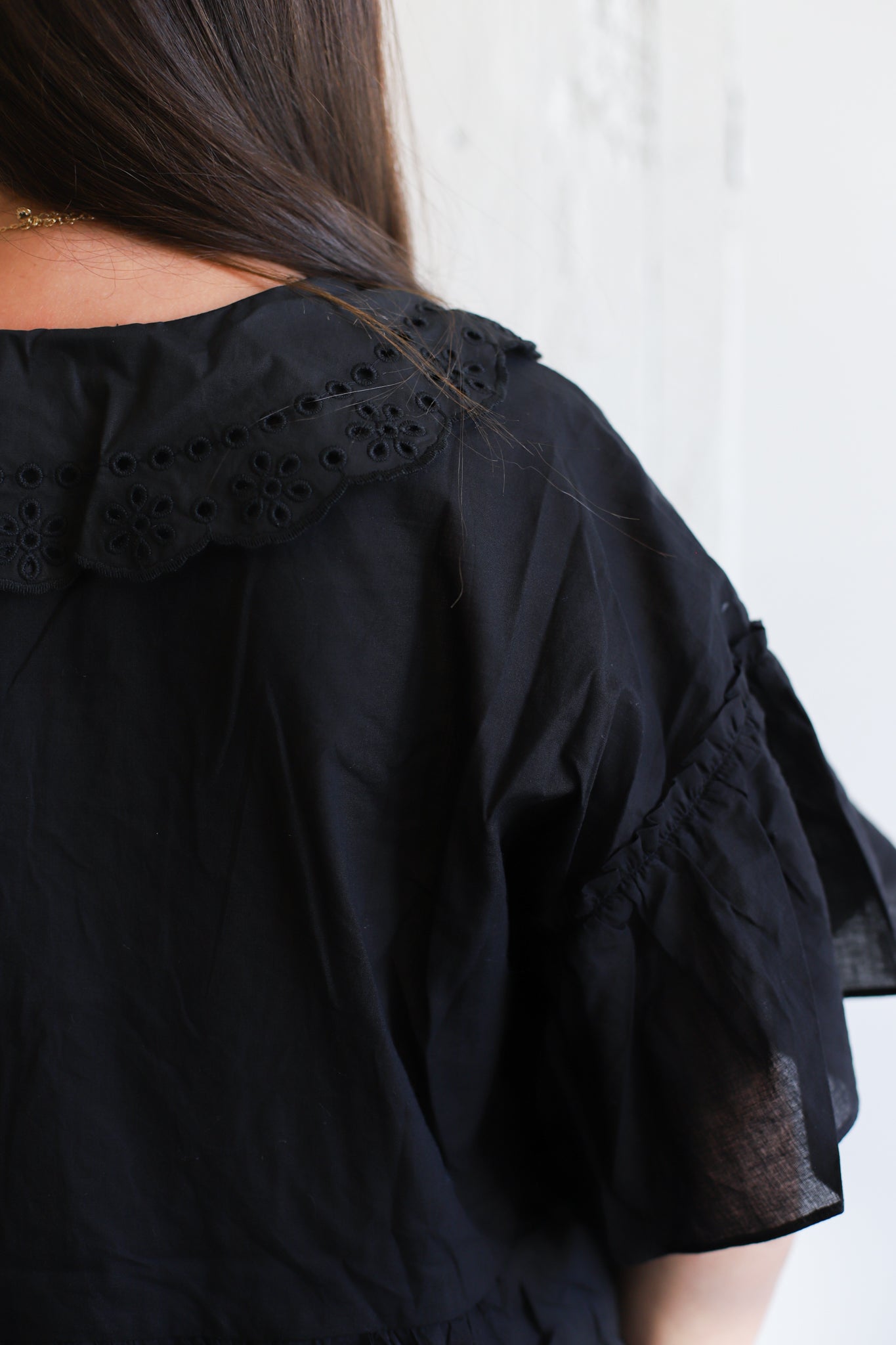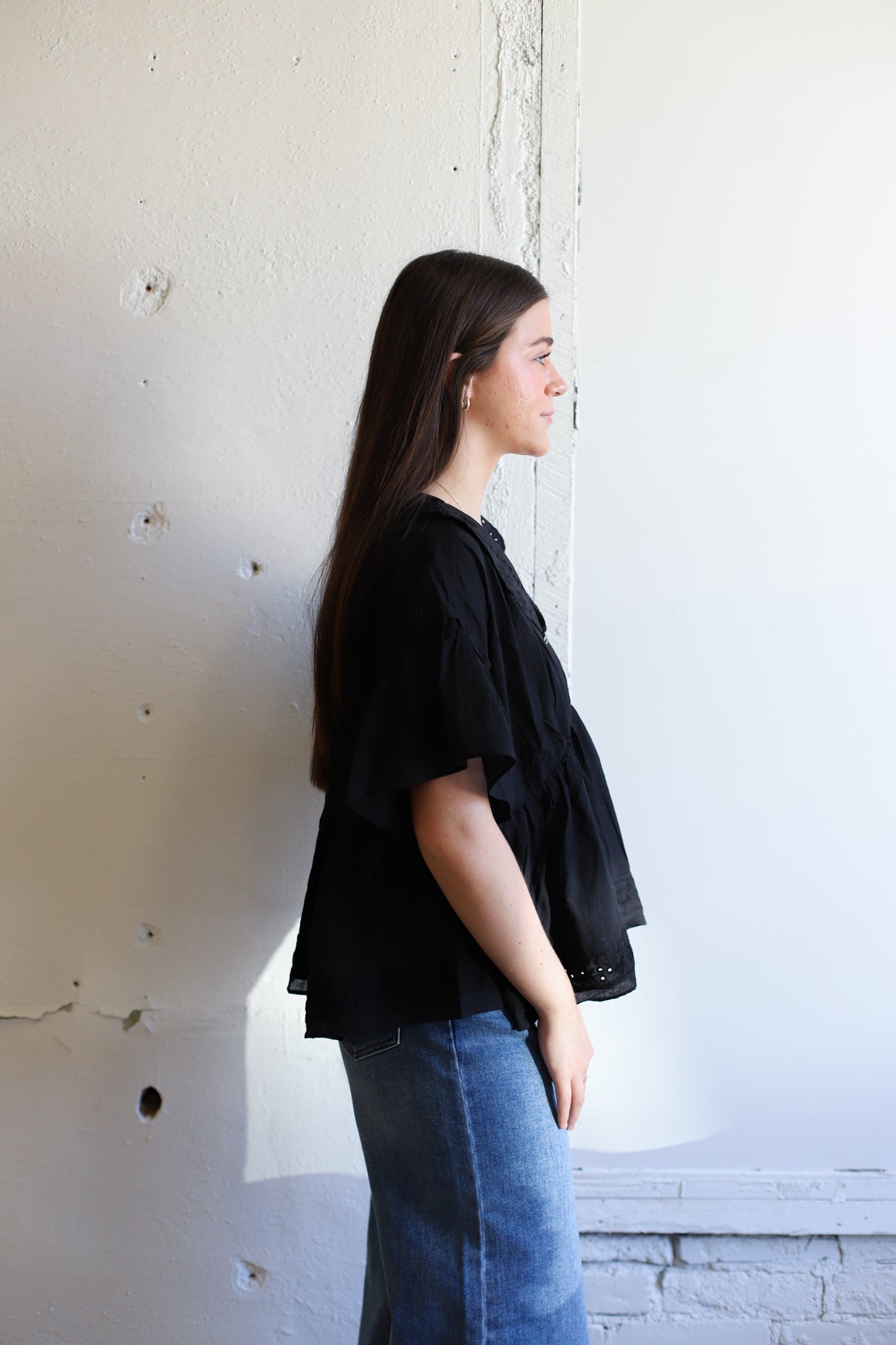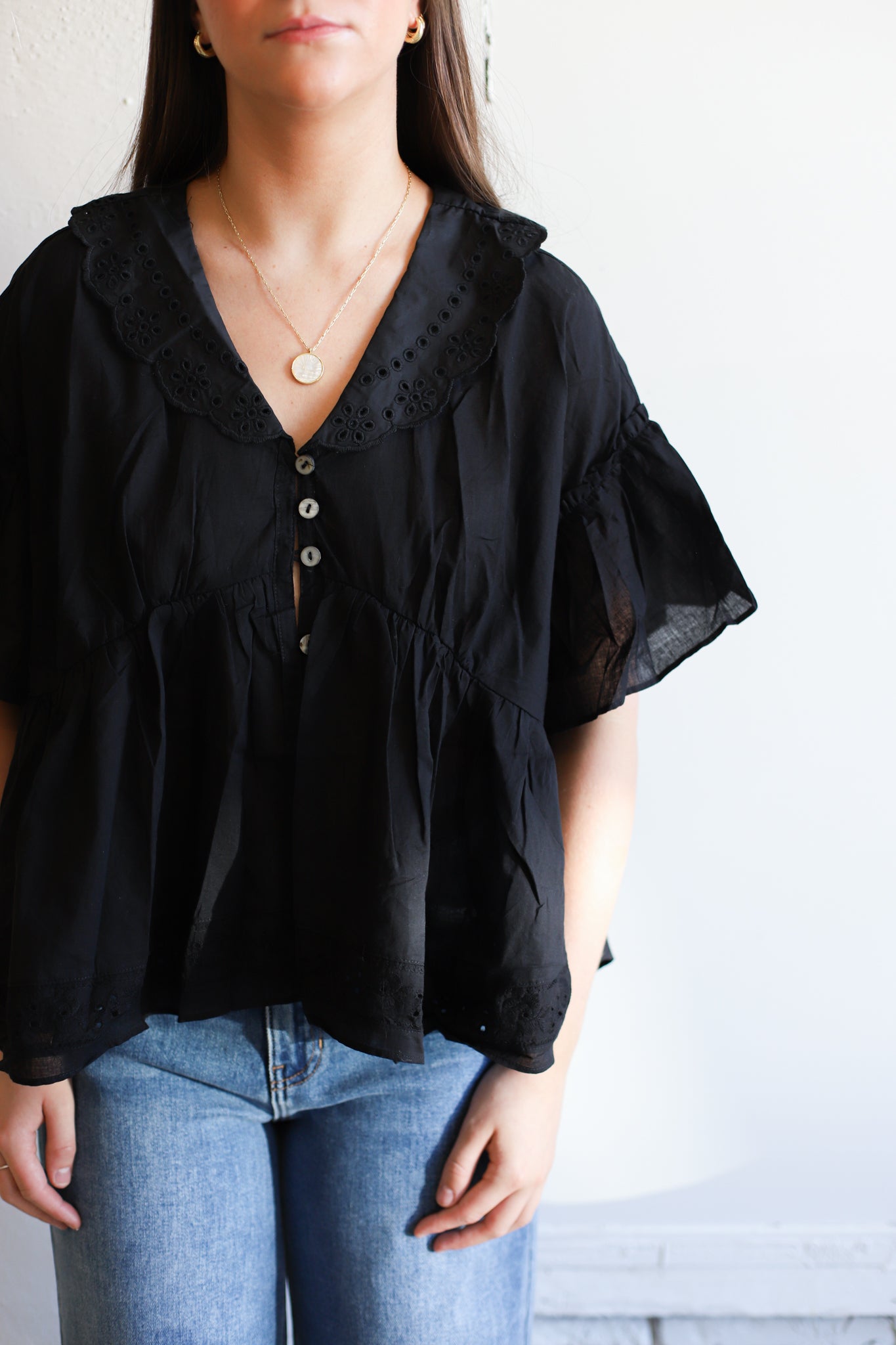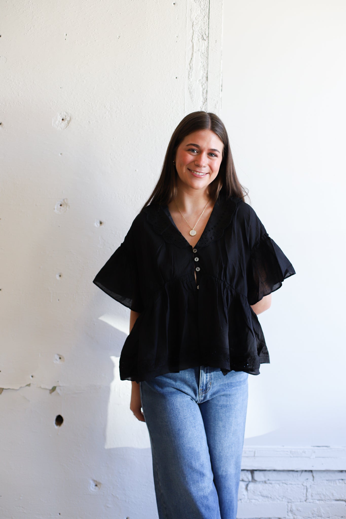 This timeless top with front button closures and a plunge neck with shawl collar is a staple for any closet! The top features elbow-length sleeves and pairs great with a pair of jeans!