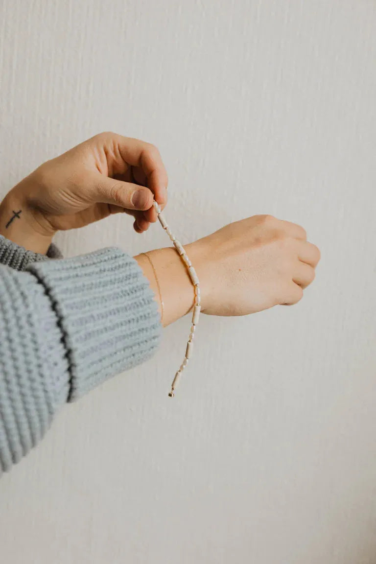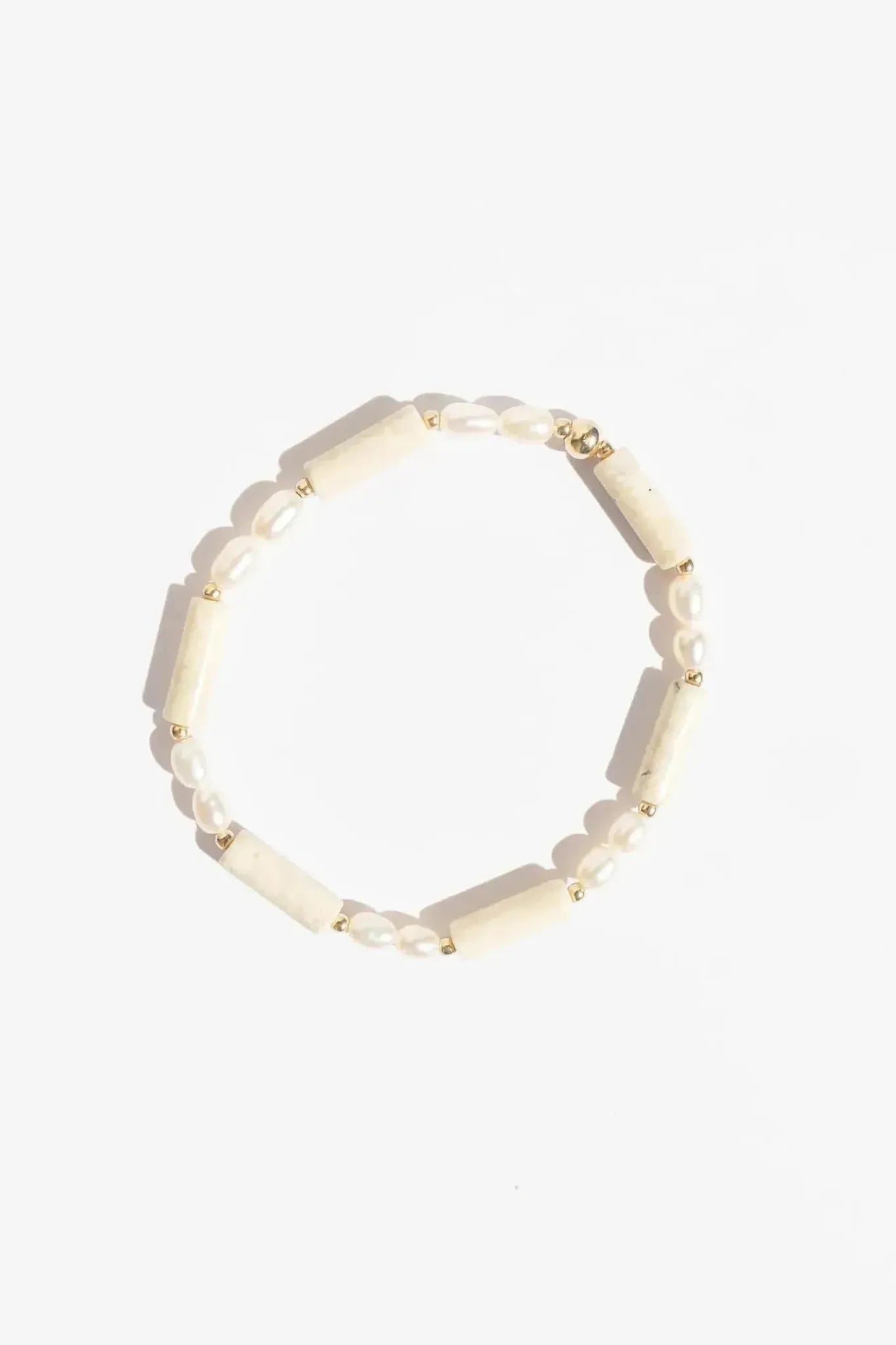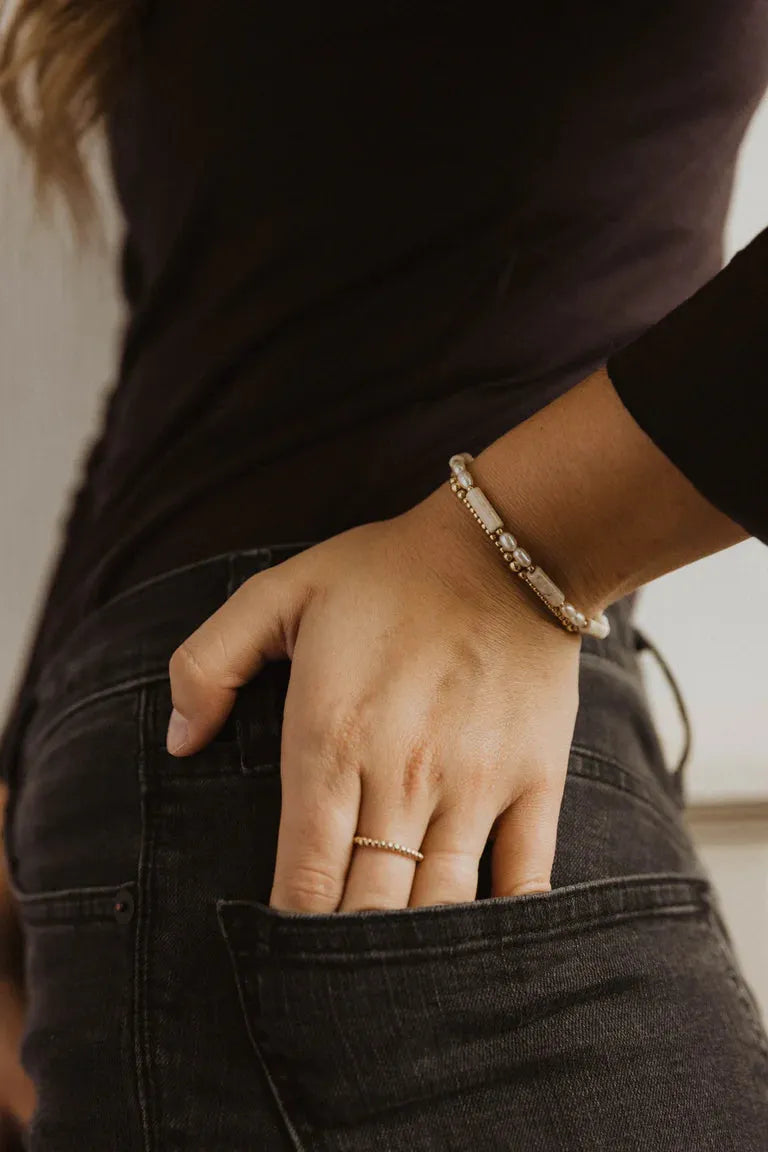 A mix of river stone and fresh water pearls coming together in a bracelet to bring beauty and grace to any outfit. Dress it up with other statement pieces or layer it with stackable bracelets to create a one-of-a-kind look!