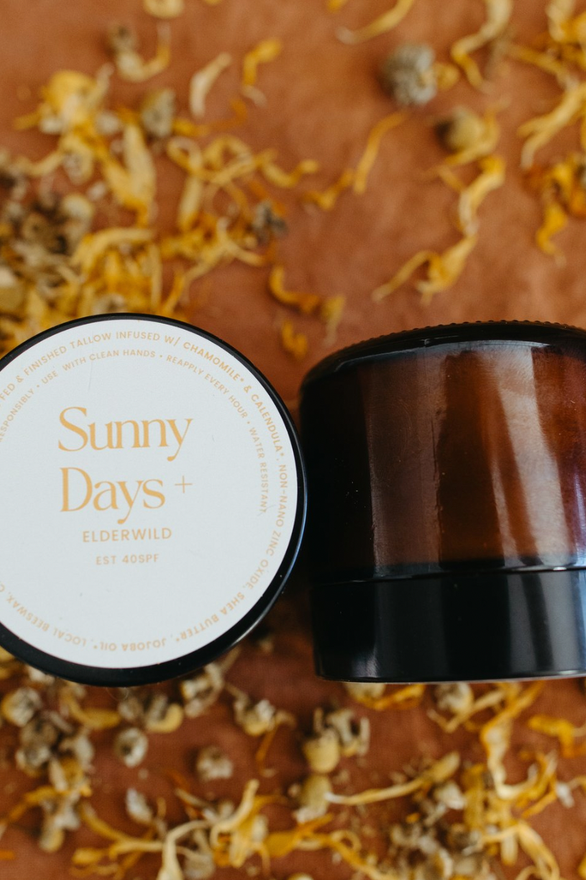 Sunny Days + is an all natural sun protection making it much safer to use than traditional sunscreens. Each ingredient was thoughtfully picked out to give you the best product for your skin. Tallow in itself is very hydrating and adds a layer of protection while also having natural SPF, making it perfect for smearing across your skin. To make the tallow even better, we infused it with Chamomile and Calendula for the soothing and anti-inflammatory properties they contain. We use non-nano zinc so that it does not penetrate your skin and get into your bloodstream, making it safe even for our smallest fans. Shea butter, while also hydrating and containing a natural SPF it is also very soothing and contains vitamins A & E making it help prevent cell damage. Jojoba oil has many benefits, but we especially love how it acts so similarly to our skin’s oil keeping your skin hydrated and having antioxidant protection. We love supporting local businesses and one of our favorites is our local beeswax! Beeswax is a great natural way to make our Sunny Days + water resistant so you will not have to reapply it as often. Lastly, we added carrot seed essential oil for its antioxidant properties, its ability to help repair damaged skin, and its natural sun protection properties plus is smells amazing.