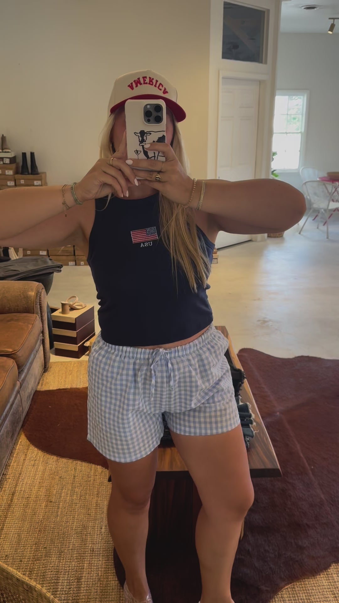 Make a bold statement with the USA Tank Top. This patriotic piece features a American flag embroidered on front with "USA" text underneath. Flattering cropped silhouette made of Soft, lightweight cotton/poly fabric featuring a Vibrant USA embroidered detail!