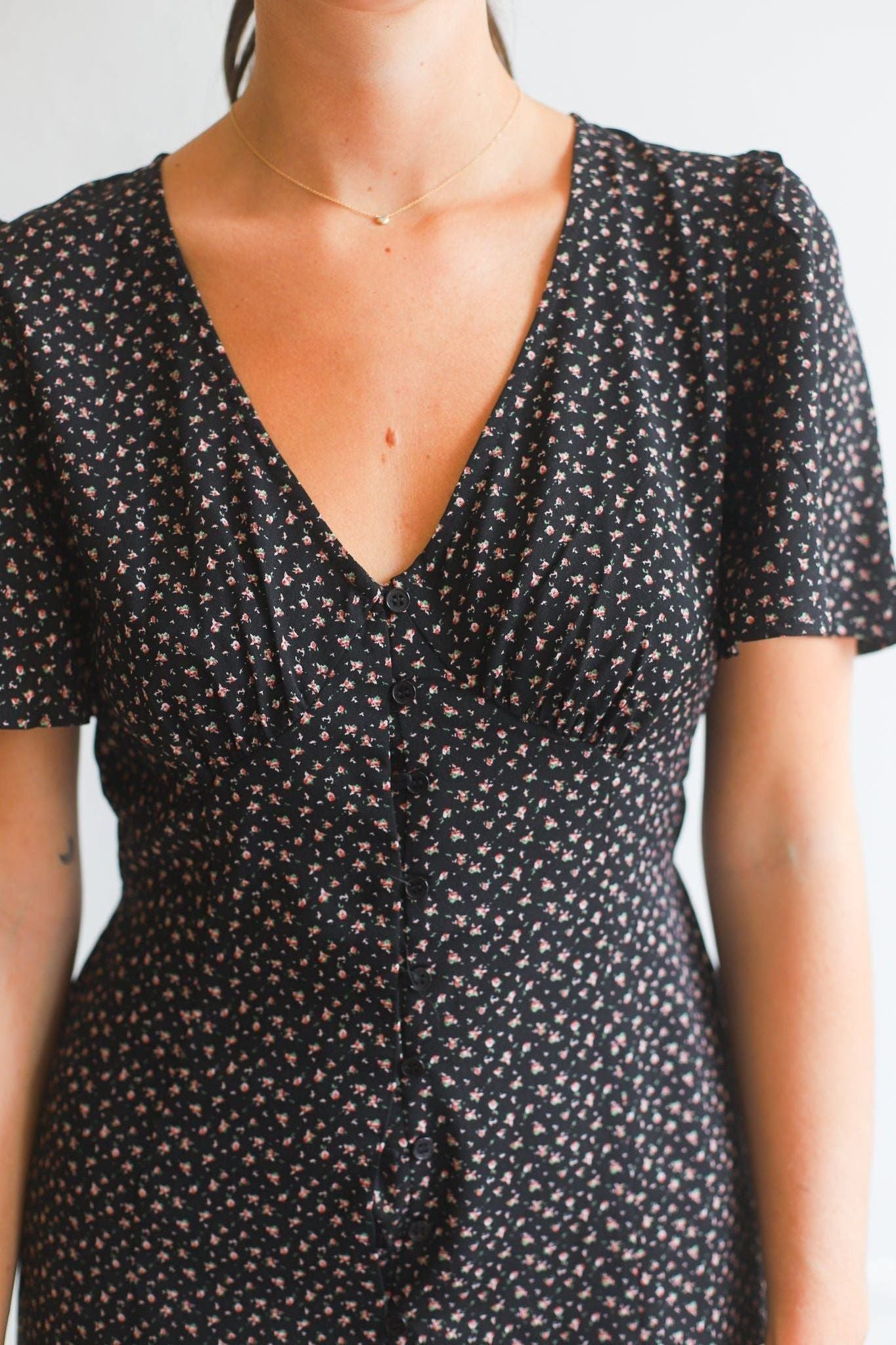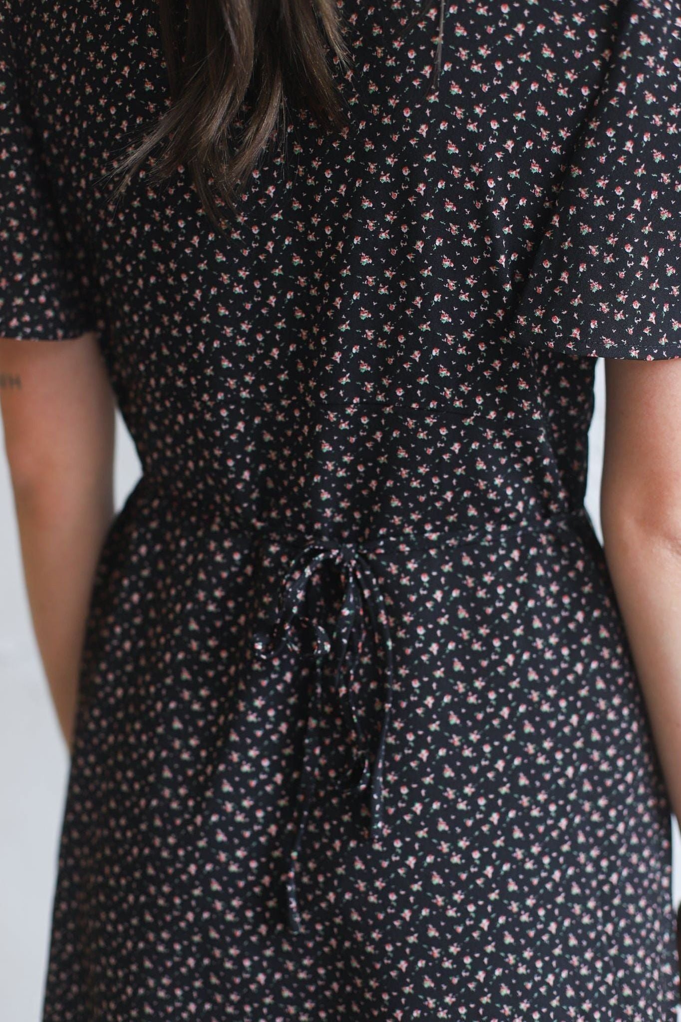 Floral mini dress with v-neck line and straps to adjust waist shape. Perfect transition piece for summer to fall!