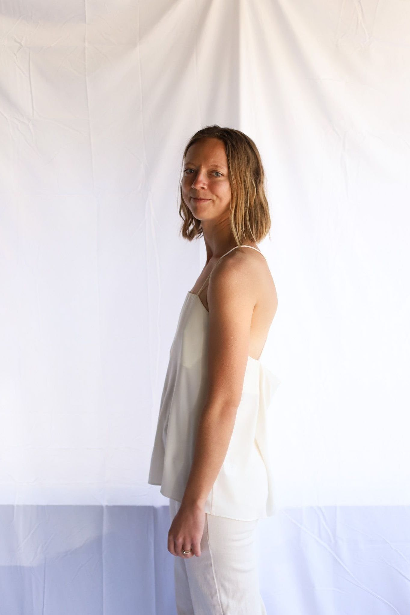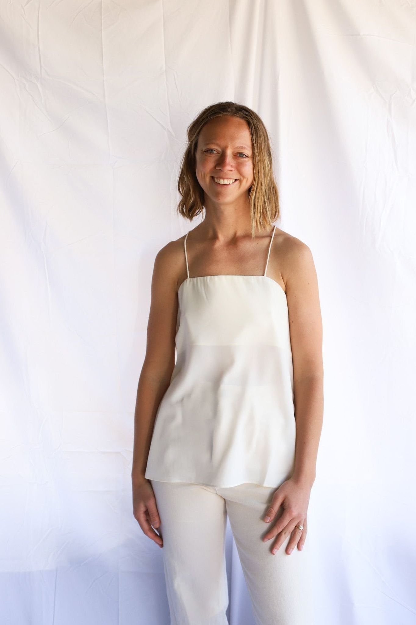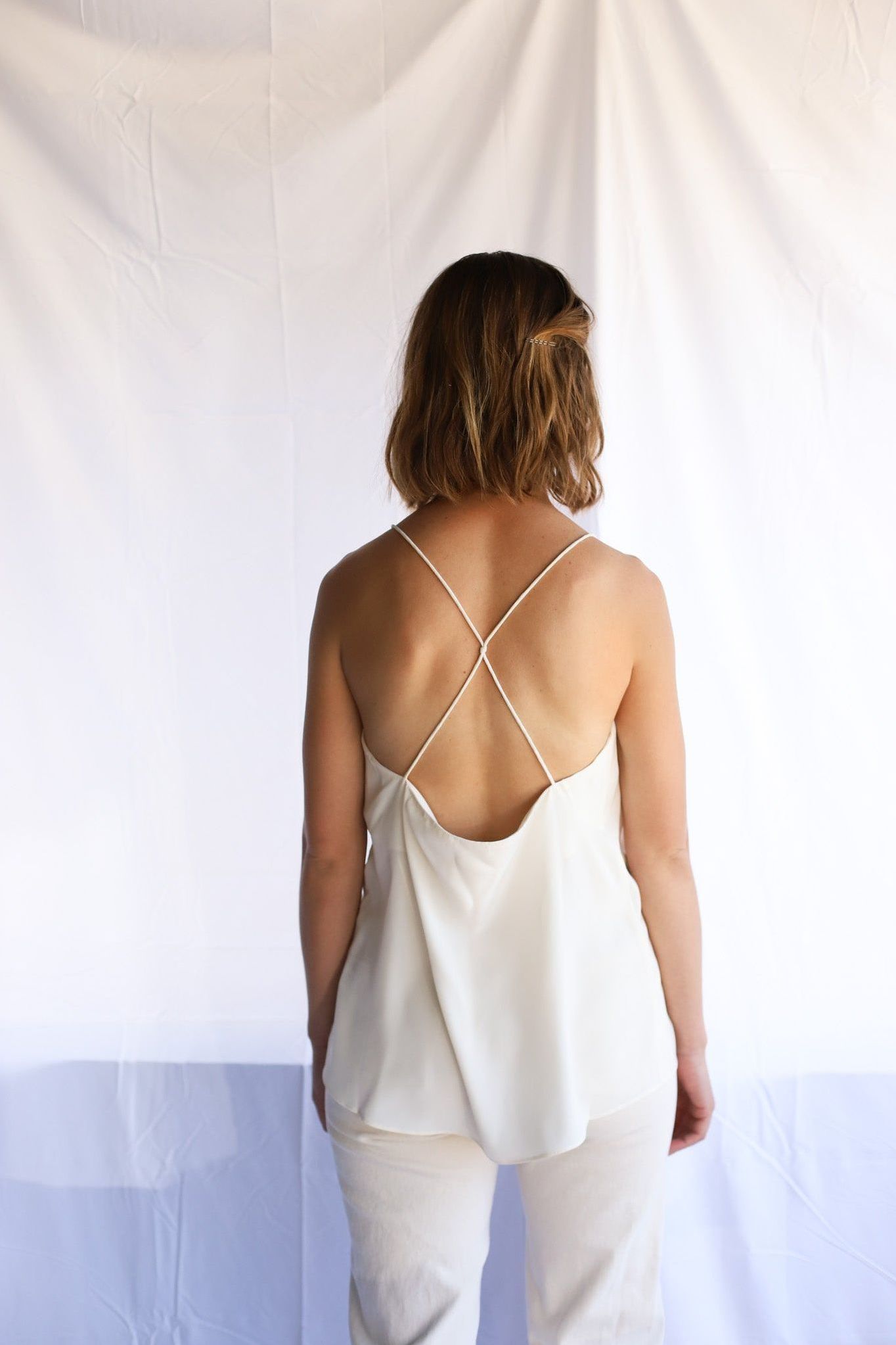 A stunning off-white tank with cross straps and dropped back. Lined on the bust.