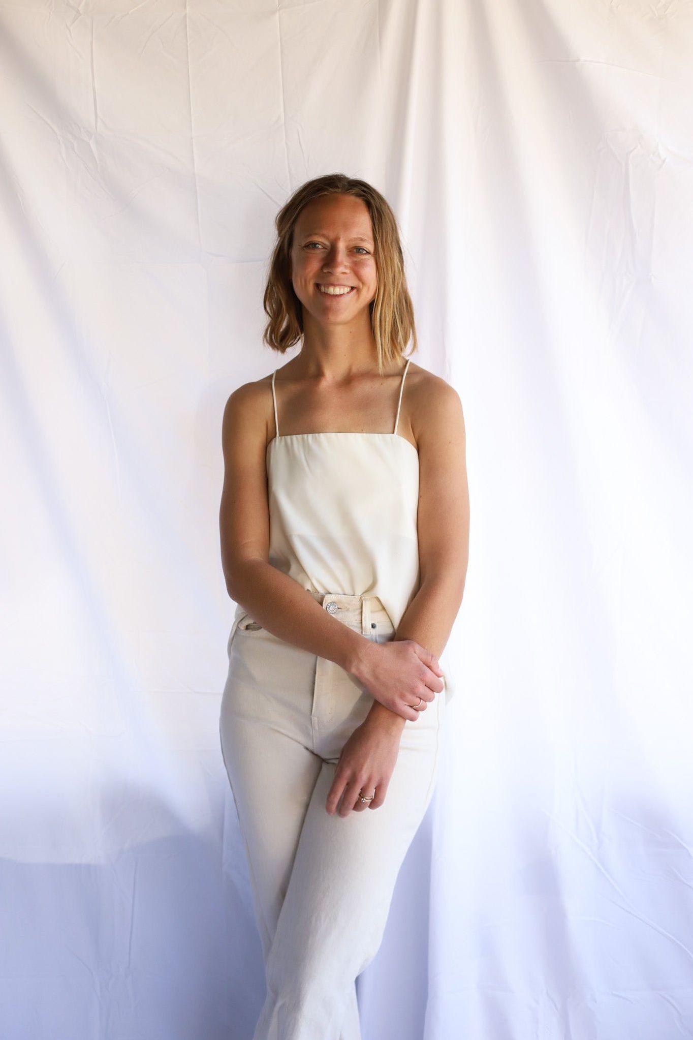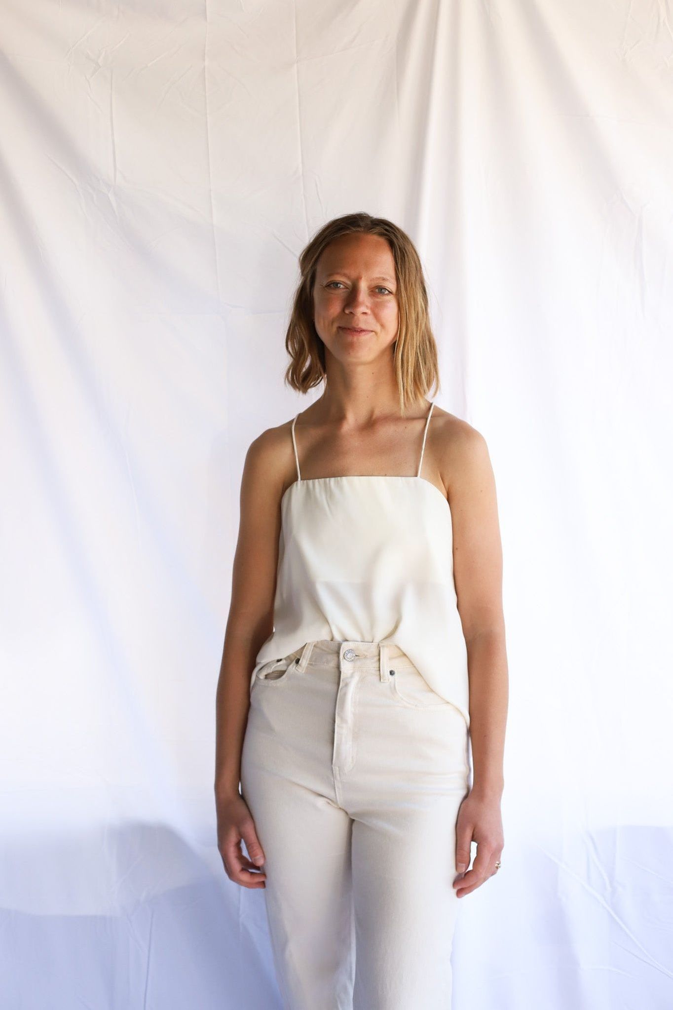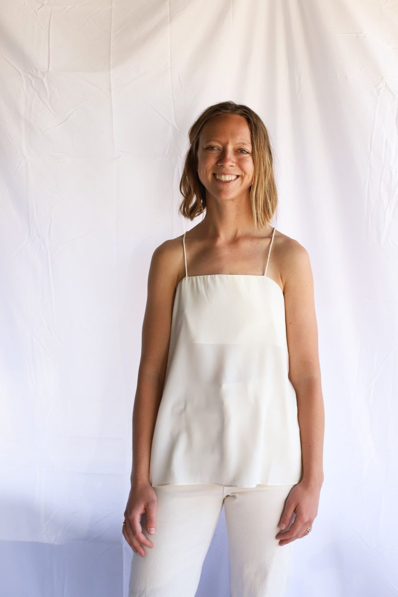 A stunning off-white tank with cross straps and dropped back. Lined on the bust.