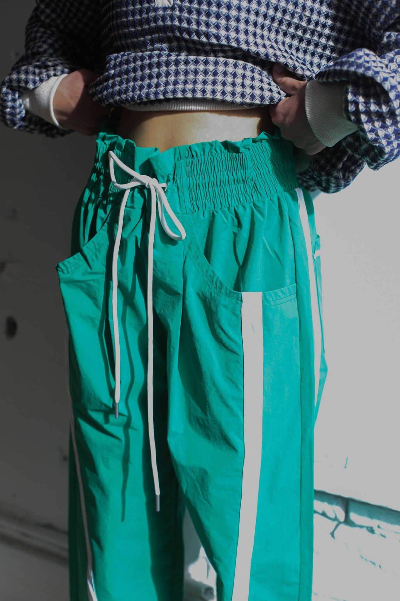 Windbreaker Pants With Contrast Stripe - Elasticated waistband with smocking detail - High-waisted - Adjustable drawstring at waist - Contrast piping detail throughout - Tulip-style bottom hem - Barrel silhouette - Relaxed fit