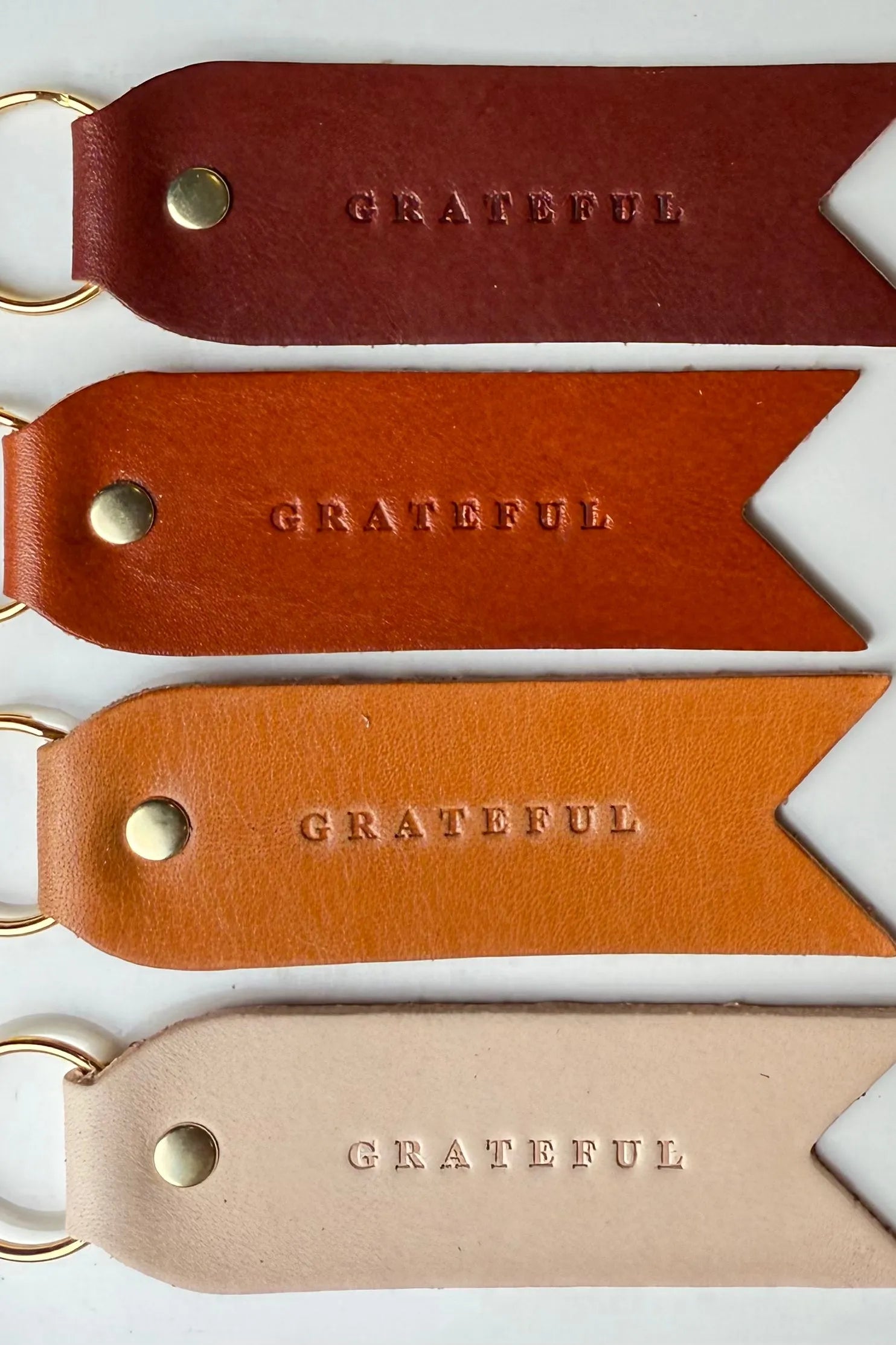 Leather keychains with the word GRATEFUL debossed, made in North Carolina by Twin Sparrow