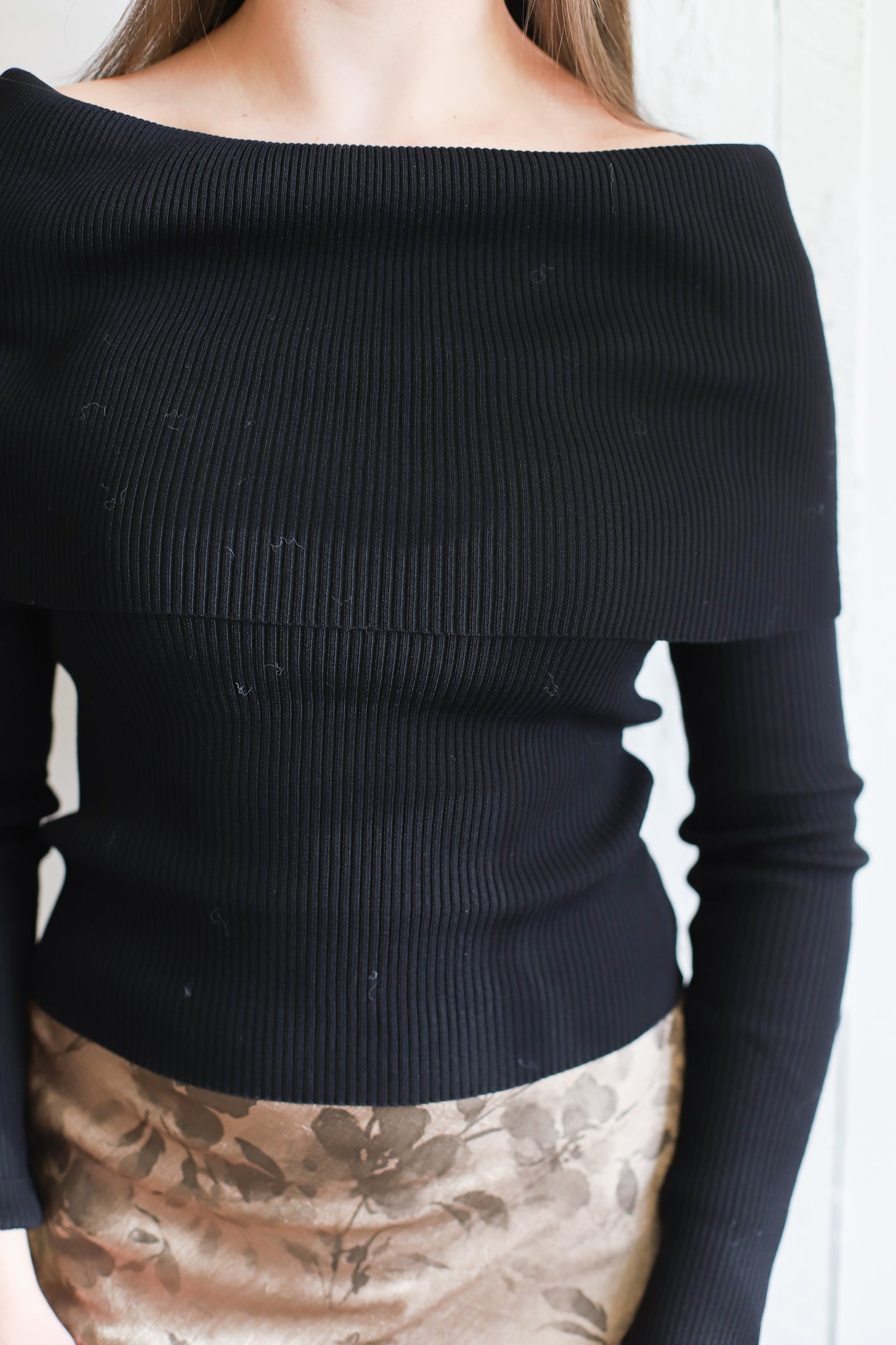 The Ellie Off the Shoulder Top is a solid ribbed knit top with featuring an off-shoulder neckline, an oversized foldover collar, long sleeves, and a fitted silhouette. The top also features premium stretch fabric and contour fit designed to sculpt the body!